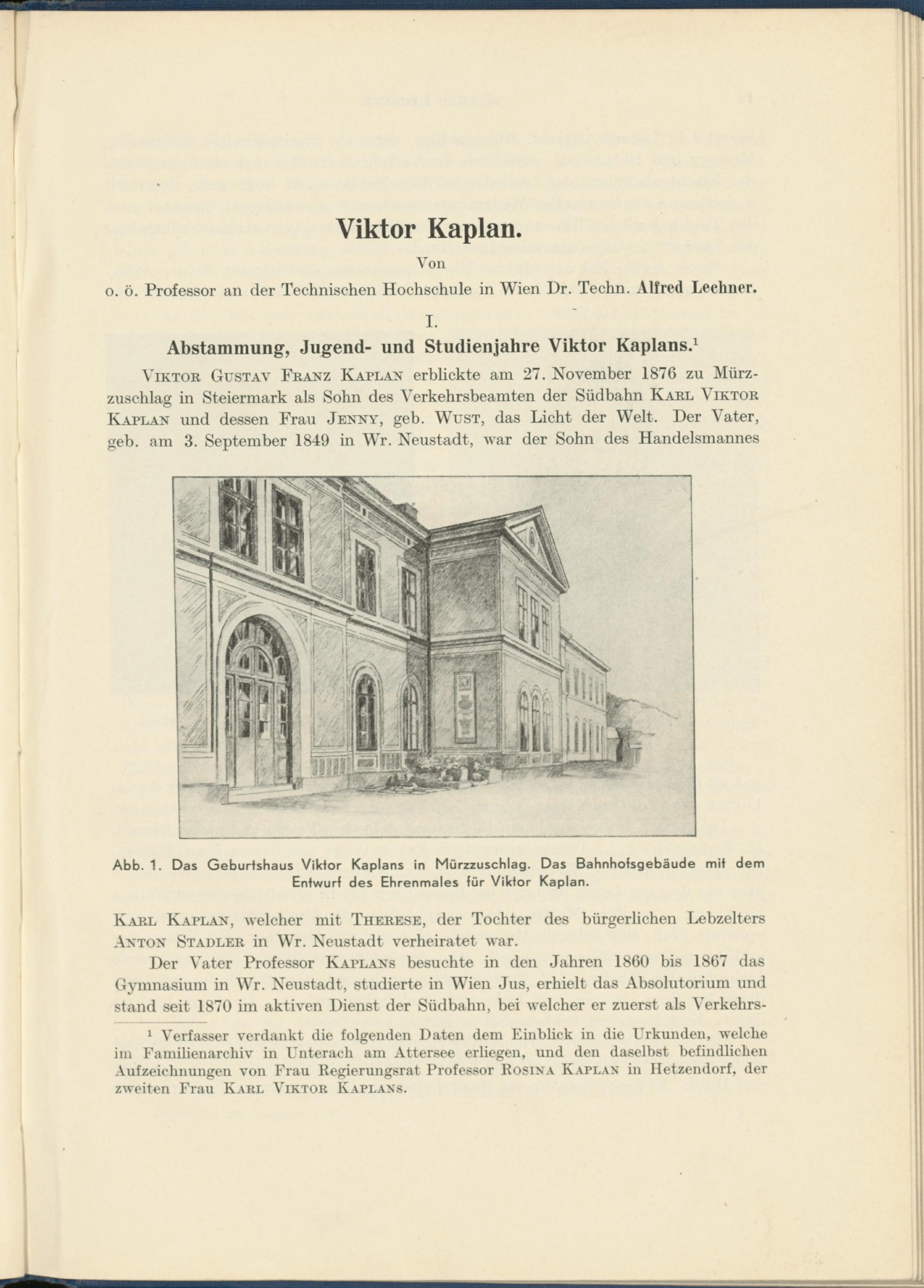 Viktor Gustav Franz Kaplan erblickte am 27. November 1876 zu Mürzzuschlag in Steiermark als Sohn des Verkehrsbeamten der Südbahn Karl Viktor Kaplan und dessen Frau Jenny, geb. Wust, das Licht der Welt. Der Vater, geb. am 3. September 1849 in Wr. Neustadt, war der Sohn des Handelsmannes