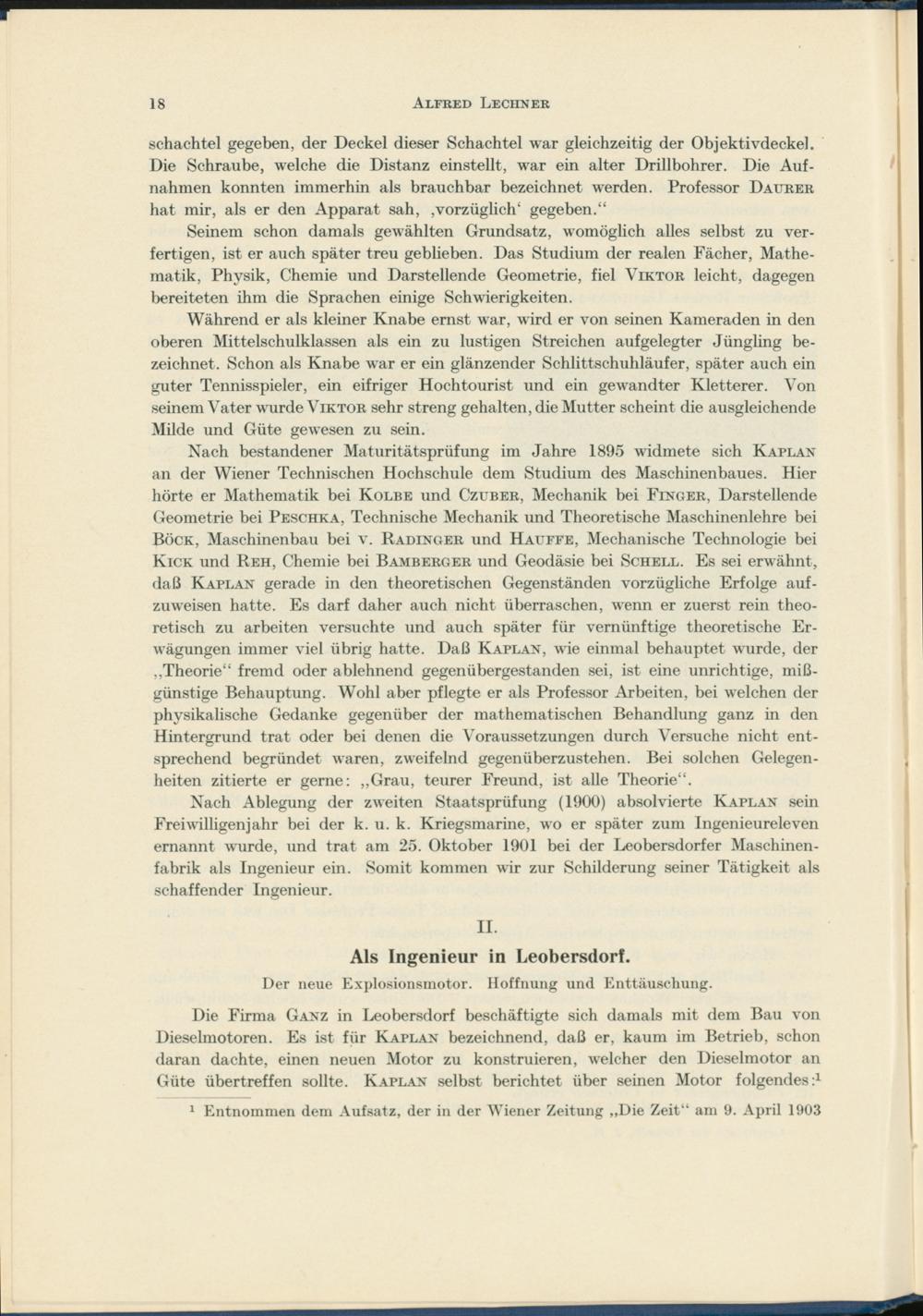 Nach Ablegung der zweiten Staatsprüfung (1900) absolvierte Kaplan sein Frei willigen jahr bei der k. u. k. Kriegsmarine, wo er später zum Ingenieureleven ernannt wurde, und trat am 25. Oktober 1901 bei der Leobersdorfer Maschinenfabrik als Ingenieur ein. Somit kommen wir zur Schilderung seiner Tätigkeit als schaffender Ingenieur.