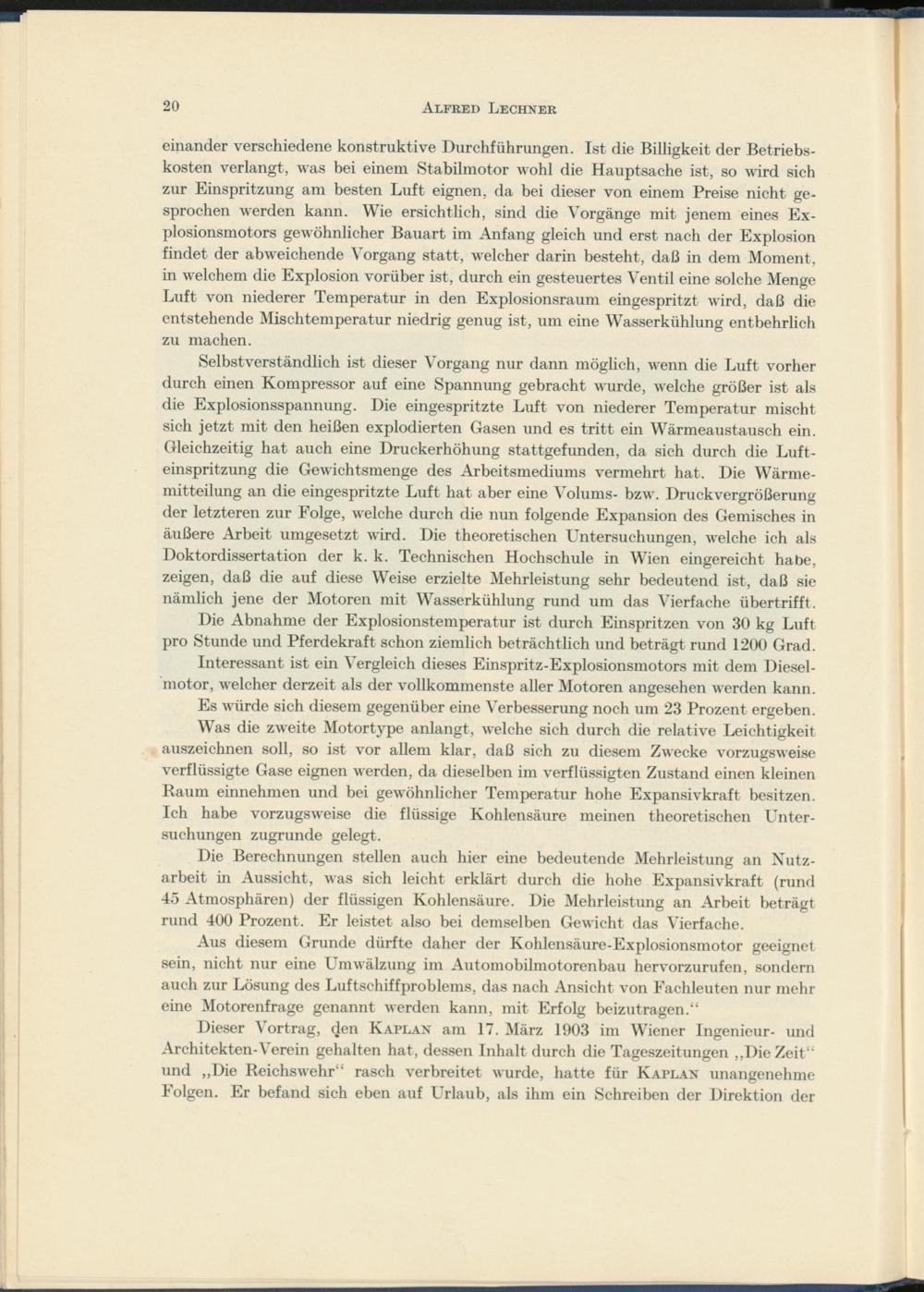Dieser Vortrag, den Kaplan am 17. März 1903 im Wiener Ingenieur- und Architekten-Verein gehalten hat, dessen Inhalt durch die Tageszeitungen ,,Die Zeit“ und „Die Reichswehr“ rasch verbreitet wurde, hatte für Kaplan unangenehme Folgen. Er befand sich eben auf Urlaub, als ihm ein Schreiben der Direktion der