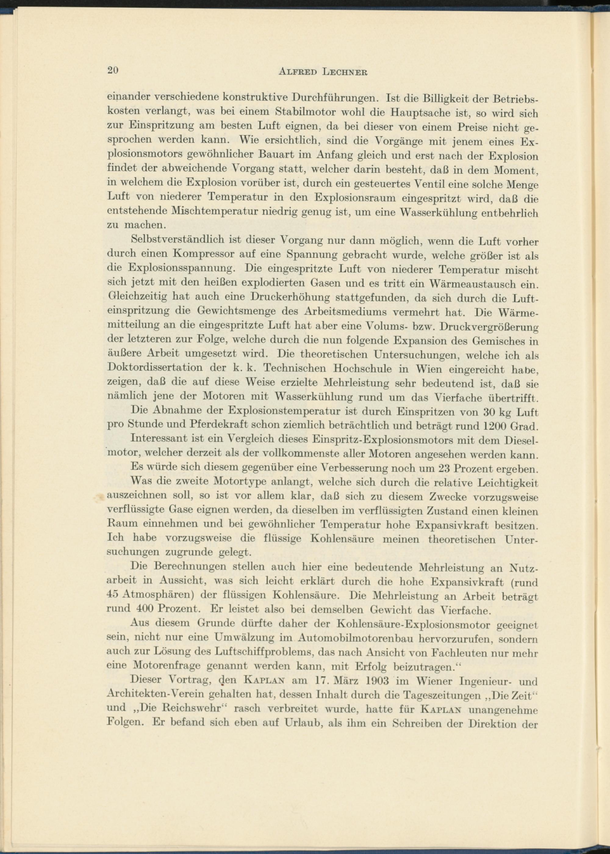 Aus diesem Grunde dürfte daher der Kohlensäure-Explosionsmotor geeignet sein, nicht nur eine Umwälzung im Automobilmotorenbau hervorzurufen, sondern auch zur Lösung des Luftschiffproblems, das nach Ansicht von Fachleuten nur mehr eine Motorenfrage genannt werden kann, mit Erfolg beizutragen.“