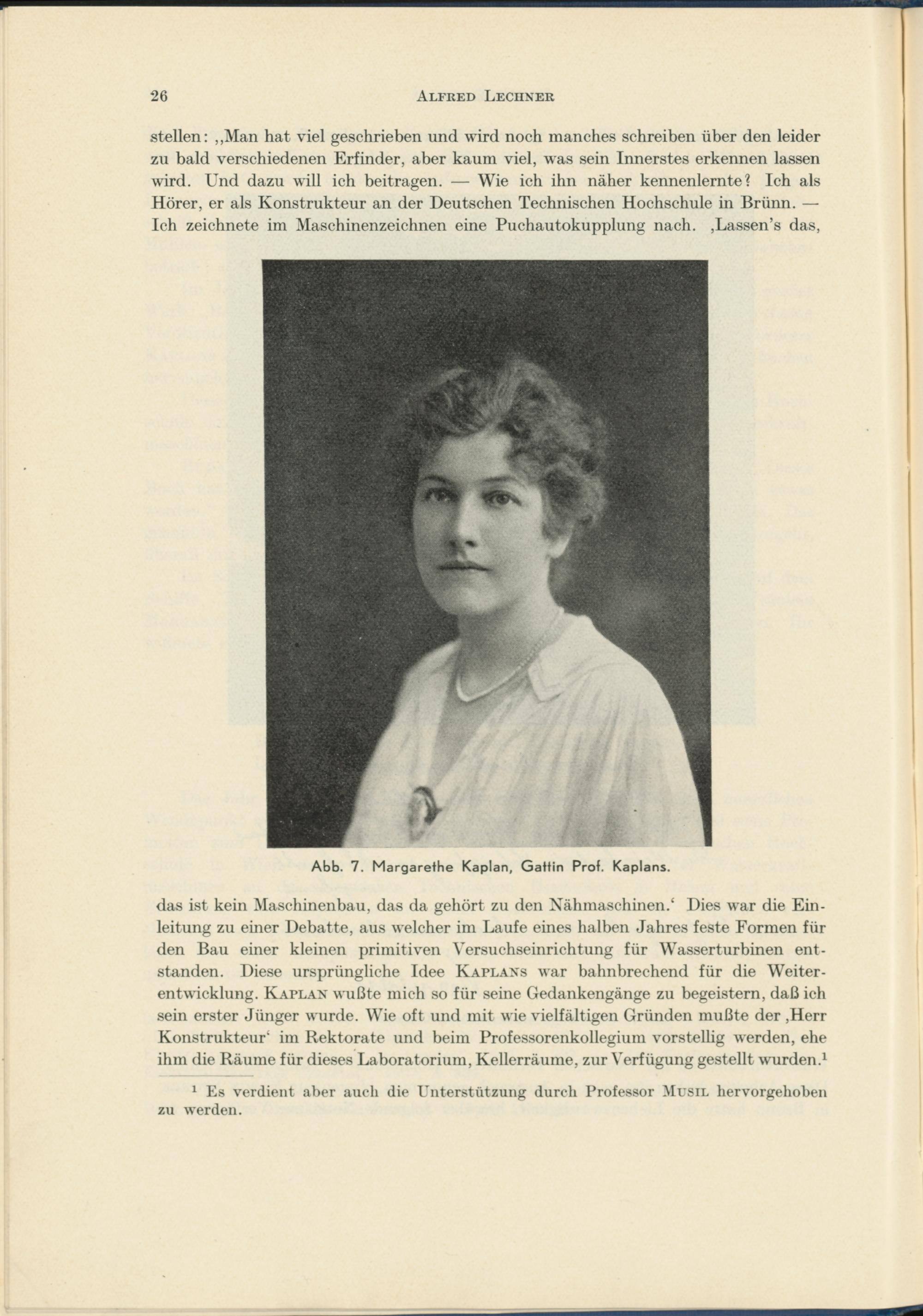 das ist kein Maschinenbau, das da gehört zu den Nähmaschinen/ Dies war die Einleitung zu einer Debatte, aus welcher im Laufe eines halben Jahres feste Formen für den Bau einer kleinen primitiven Versuchseinrichtung für Wasserturbinen entstanden. Diese ursprüngliche Idee Kaplans war bahnbrechend für die Weiterentwicklung. Kaplan wußte mich so für seine Gedankengänge zu begeistern, daß ich sein erster Jünger wurde. Wie oft und mit wie vielfältigen Gründen mußte der ,Herr Konstrukteur 4 im Rektorate und beim Professorenkollegium vorstellig werden, ehe ihm die Räume für dieses Laboratorium, Kellerräume, zur Verfügung gestellt wurden . 1