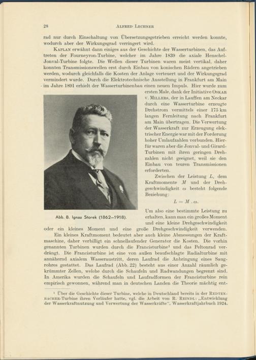 1 Über die Geschichte dieser Turbine, welche in Deutschland bereits in der Redtex- BACHER-Turbine ihren Vorläufer hatte, vgl. die Arbeit von R. Reindl: „Entwicklung der Wasserkraftnutzung und Verwertung der Wasserkräfte“, Wasserkraftjahrbuch 1924.