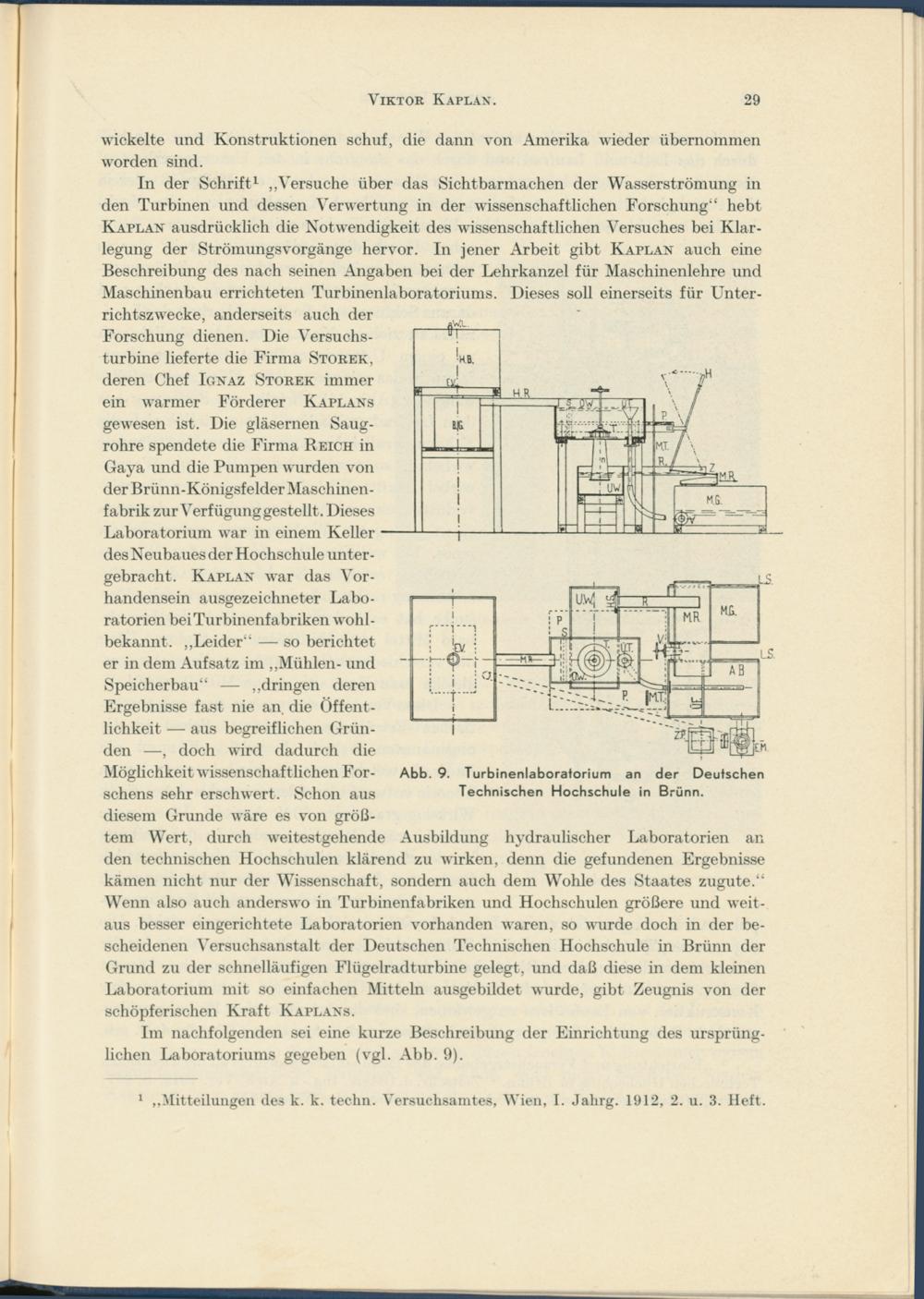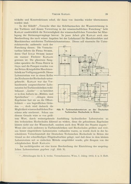 In der Schrift 1 „Versuche über das Sicht barmachen der Wasserströmung in den Turbinen und dessen Verwertung in der wissenschaftlichen Forschung“ hebt Kaplan ausdrücklich die Notwendigkeit des wissenschaftlichen Versuches bei Klarlegung der Strömungsvorgänge hervor. In jener Arbeit gibt Kaplan auch eine Beschreibung des nach seinen Angaben bei der Lehrkanzel für Maschinenlehre und Maschinenbau errichteten Turbinenlaboratoriums. Dieses soll einerseits für Unterrichtszwecke, anderseits auch der Forschung dienen. Die Versuchsturbine lieferte die Firma Storek, deren Chef Ignaz Storek immer ein warmer Förderer Kaplans gewesen ist. Die gläsernen Saugrohre spendete die Firma Reich in Gaya und die Pumpen wurden von der Brünn-Königsfelder Maschinenfabrik zur Verfügung gestellt. Dieses Laboratorium war in einem Keller des Neubaues der Hochschule untergebracht. Kaplan war das Vorhandensein ausgezeichneter Laboratorien bei Turbinenfabriken wohl- bekannt. „Leider“ — so berichtet er in dem Aufsatz im „Mühlen- und Speicherbau“ — „dringen deren Ergebnisse fast nie an die Öffentlichkeit — aus begreiflichen Gründen —, doch wird dadurch die Möglichkeit wissenschaftlichen Forschern sehr erschwert. Schon aus diesem Grunde wäre es von größtem Wert, durch weitestgehende Ausbildung hydraulischer Laboratorien an den technischen Hochschulen klärend zu wirken, denn die gefundenen Ergebnisse kämen nicht nur der Wissenschaft, sondern auch dem Wohle des Staates zugute.“ Wenn also auch anderswo in Turbinenfabriken und Hochschulen größere und weitaus besser eingerichtete Laboratorien vorhanden waren, so wurde doch in der bescheidenen Versuchsanstalt der Deutschen Technischen Hochschule in Brünn der Grund zu der schnelläufigen Flügelradturbine gelegt, und daß diese in dem kleinen Laboratorium mit so einfachen Mitteln ausgebildet wurde, gibt Zeugnis von der schöpferischen Kraft Kaplans.