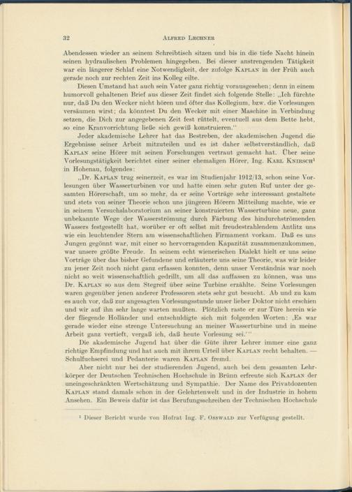 ,,Dr. Kaplan trug seinerzeit, es war im Studienjahr 1912/13, schon seine Vorlesungen über Wasserturbinen vor und hatte einen sehr guten Ruf unter der gesamten Hörerschaft, um so mehr, da er seine Vorträge sehr interessant gestaltete und stets von seiner Theorie schon uns jüngeren Hörern Mitteilung machte, wie er in seinem Versuchslaboratorium an seiner konstruierten Wasserturbine neue, ganz unbekannte Wege der Wasserströmung durch Färbung des hindurchströmenden Wassers festgestellt hat, worüber er oft selbst mit freudestrahlendem Antlitz uns wie ein leuchtender Stern am wissenschaftlichen Firmament vorkam. Daß es uns Jungen gegönnt war, mit einer so hervorragenden Kapazität zusammenzukommen, war unsere größte Freude. In seinem echt wienerischen Dialekt hielt er uns seine Vorträge über das bisher Gefundene und erläuterte uns seine Theorie, was wir leider zu jener Zeit noch nicht ganz erfassen konnten, denn unser Verständnis war noch nicht so weit wissenschaftlich gedrillt, um all das auffassen zu können, was uns Dr. Kaplan so aus dem Stegreif über seine Turbine erzählte. Seine Vorlesungen waren gegenüber jenen anderer Professoren stets sehr gut besucht. Ab und zu kam es auch vor, daß zur angesagten Vorlesungsstunde unser lieber Doktor nicht erschien und wir auf ihn sehr lange warten mußten. Plötzlich raste er zur Türe herein wie der fliegende Holländer und entschuldigte sich mit folgenden Worten: ,Es war gerade wieder eine strenge Untersuchung an meiner Wasserturbine und in meine Arbeit ganz vertieft, vergaß ich, daß heute Vorlesung sei.‘“