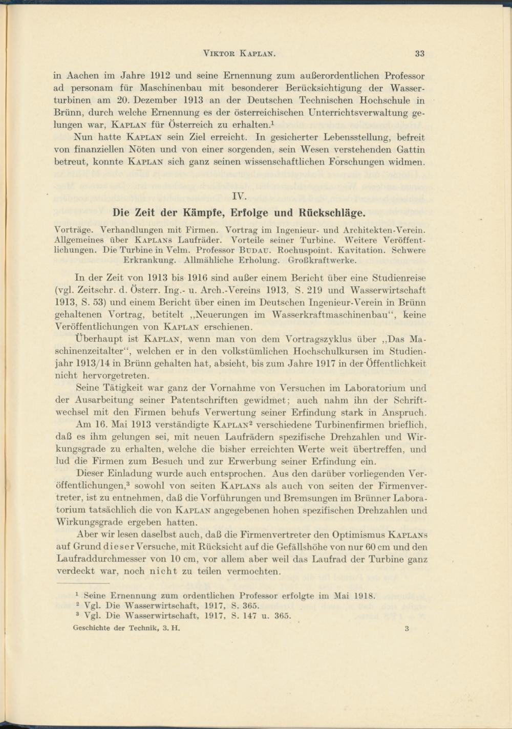 in Aachen im Jahre 1912 und seine Ernennung zum außerordentlichen Professor ad personam für Maschinenbau mit besonderer Berücksichtigung der Wasserturbinen am 20. Dezember 1913 an der Deutschen Technischen Hochschule in Brünn, durch welche Ernennung es der österreichischen Unterrichts Verwaltung gelungen war, Kaplan für Österreich zu erhalten. 1