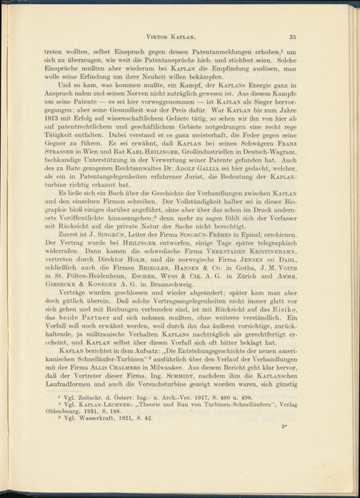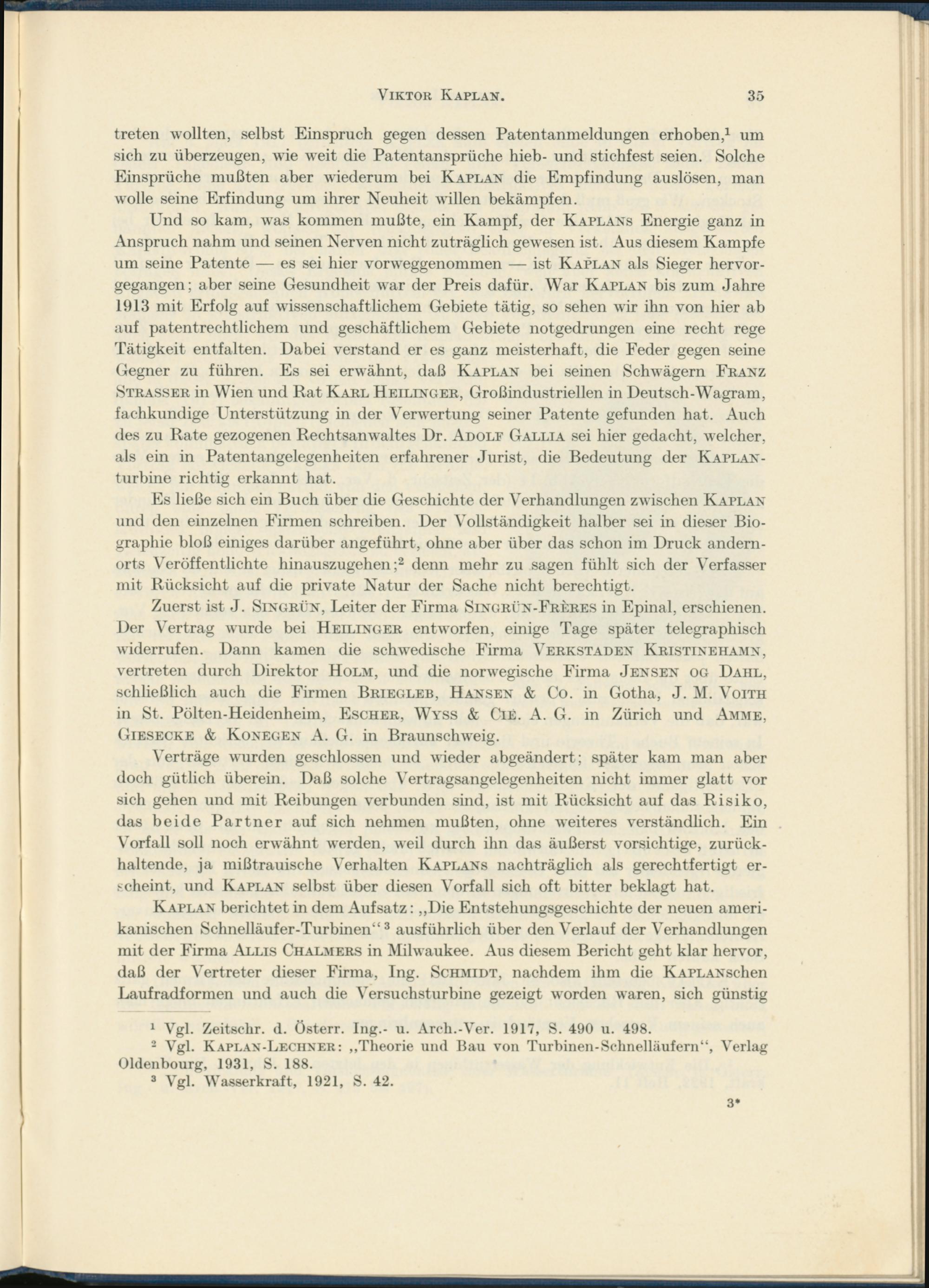 Und so kam, was kommen mußte, ein Kampf, der Kaplans Energie ganz in Anspruch nahm und seinen Nerven nicht zuträglich gewesen ist. Aus diesem Kampfe um seine Patente — es sei hier vorweggenommen — ist Kaplan als Sieger hervorgegangen; aber seine Gesundheit war der Preis dafür. War Kaplan bis zum Jahre 1913 mit Erfolg auf wissenschaftlichem Gebiete tätig, so sehen wir ihn von hier ab auf patentrechtlichem und geschäftlichem Gebiete notgedrungen eine recht rege Tätigkeit entfalten. Dabei verstand er es ganz meisterhaft, die Feder gegen seine Gegner zu führen. Es sei erwähnt, daß Kaplan bei seinen Schwägern Franz Strasser in Wien und Rat Karl Heilinger, Großindustriellen in Deutsch-Wagram, fachkundige Unterstützung in der Verwertung seiner Patente gefunden hat. Auch des zu Rate gezogenen Rechtsanwaltes Dr. Adolf Gallia sei hier gedacht, welcher, als ein in Patentangelegenheiten erfahrener Jurist, die Bedeutung der Kaplan- turbine richtig erkannt hat.