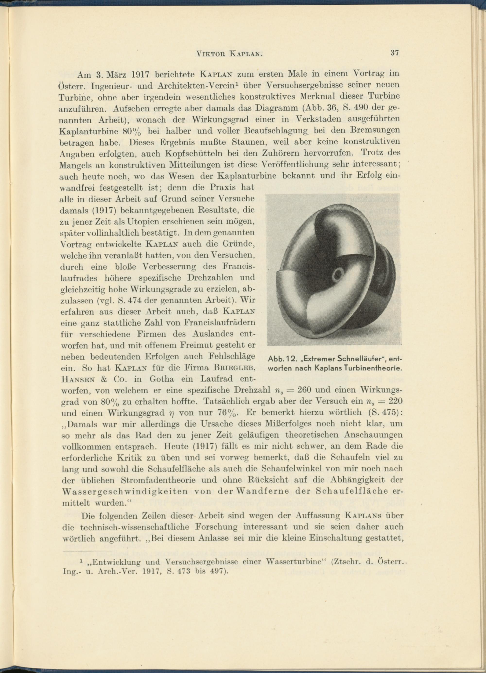Am 3. März 1917 berichtete Kaplan zum ersten Male in einem Vortrag im Österr. Ingenieur- und Architekten-Verein 1 über Versuchsergebnisse seiner neuen Turbine, ohne aber irgendein wesentliches konstruktives Merkmal dieser Turbine anzuführen. Aufsehen erregte aber damals das Diagramm (Abb. 36, S. 490 der genannten Arbeit), wonach der Wirkungsgrad einer in Verkstaden ausgeführten Kaplanturbine 80% bei halber und voller Beaufschlagung^ bei den Bremsungen betragen habe. Dieses Ergebnis mußte Staunen, weil aber keine konstruktiven Angaben erfolgten, auch Kopfschütteln bei den Zuhörern hervorrufen. Trotz des Mangels an konstruktiven Mitteilungen ist diese Veröffentlichung sehr interessant ; auch heute noch, wo das Wesen der Kaplanturbine bekannt und ihr Erfolg einwandfrei festgestellt ist; denn die Praxis hat alle in dieser Arbeit auf Grund seiner Versuche damals (1917) bekanntgegebenen Resultate, die zu jener Zeit als Utopien erschienen sein mögen, später vollinhaltlich bestätigt . In dem genannten Vortrag entwickelte Kaplan auch die Gründe, welche ihn veranlaßt hatten, von den Versuchen, durch eine bloße Verbesserung des Francislaufrades höhere spezifische Drehzahlen und gleichzeitig hohe Wirkungsgrade zu erzielen, abzulassen (vgl. S. 474 der genannten Arbeit). Wir erfahren aus dieser Arbeit auch, daß Kaplan eine ganz stattliche Zahl von Francislauf rädern für verschiedene Firmen des Auslandes entworfen hat, und mit offenem Freimut gesteht er neben bedeutenden Erfolgen auch Fehlschläge ein. So hat Kaplan für die Firma Briegleb,