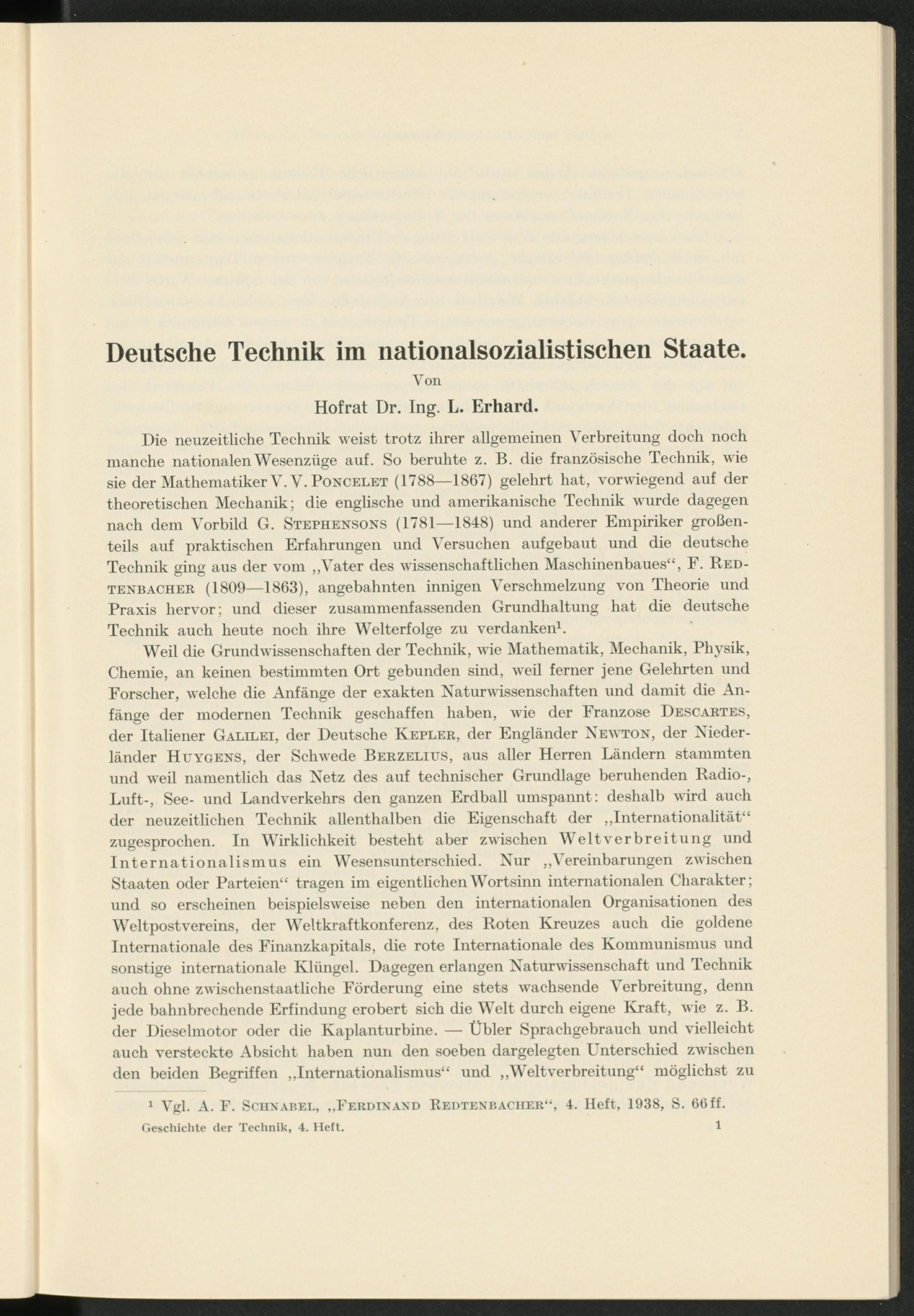 Die neuzeitliche Technik weist trotz ihrer allgemeinen Verbreitung doch noch manche nationalen Wesenzüge auf. So beruhte z. B. die französische Technik, wie sie der Mathematiker V.V. Poncelet (1788—1867) gelehrt hat, vorwiegend auf der theoretischen Mechanik; die englische und amerikanische Technik wurde dagegen nach dem Vorbild G. Stephensons (1781—1848) und anderer Empiriker großenteils auf praktischen Erfahrungen und Versuchen aufgebaut und die deutsche Technik ging aus der vom „Vater des wissenschaftlichen Maschinenbaues“, F. Red- tenbacher (1809—1863), angebahnten innigen Verschmelzung von Theorie und Praxis hervor; und dieser zusammenfassenden Grundhaltung hat die deutsche Technik auch heute noch ihre Welterfolge zu verdanken 1 .