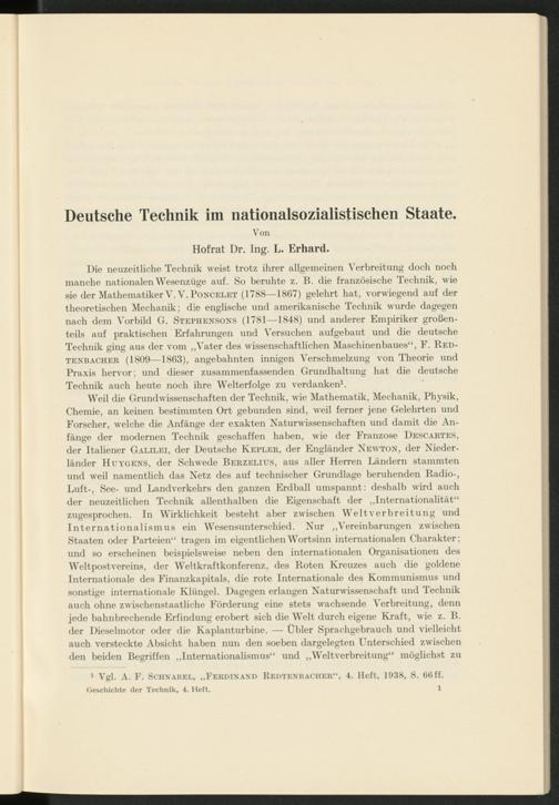 Weil die Grundwissenschaften der Technik, wie Mathematik, Mechanik, Physik, Chemie, an keinen bestimmten Ort gebunden sind, weil ferner jene Gelehrten und Forscher, welche die Anfänge der exakten Naturwissenschaften und damit die Anfänge der modernen Technik geschaffen haben, wie der Franzose Descartes, der Italiener Galilei, der Deutsche Kepler, der Engländer Newton, der Niederländer Huygens, der Schwede Berzelius, aus aller Herren Ländern stammten und weil namentlich das Netz des auf technischer Grundlage beruhenden Radio-, Luft-, See- und Landverkehrs den ganzen Erdball umspannt: deshalb wird auch der neuzeitlichen Technik allenthalben die Eigenschaft der „Internationalität“ zugesprochen. In Wirklichkeit besteht aber zwischen Welt Verbreitung und Internationalismus ein Wesensunterschied. Nur „Vereinbarungen zwischen Staaten oder Parteien“ tragen im eigentlichen Wortsinn internationalen Charakter; und so erscheinen beispielsweise neben den internationalen Organisationen des Weltpostvereins, der Weltkraftkonferenz, des Roten Kreuzes auch die goldene Internationale des Finanzkapitals, die rote Internationale des Kommunismus und sonstige internationale Klüngel. Dagegen erlangen Naturwissenschaft und Technik auch ohne zwischenstaatliche Förderung eine stets wachsende Verbreitung, denn jede bahnbrechende Erfindung erobert sich die Welt durch eigene Kraft, wie z. B. der Dieselmotor oder die Kaplanturbine. — Übler Sprachgebrauch und vielleicht auch versteckte Absicht haben nun den soeben dargelegten Unterschied zwischen den beiden Begriffen „Internationalismus“ und „Weltverbreitung“ möglichst zu