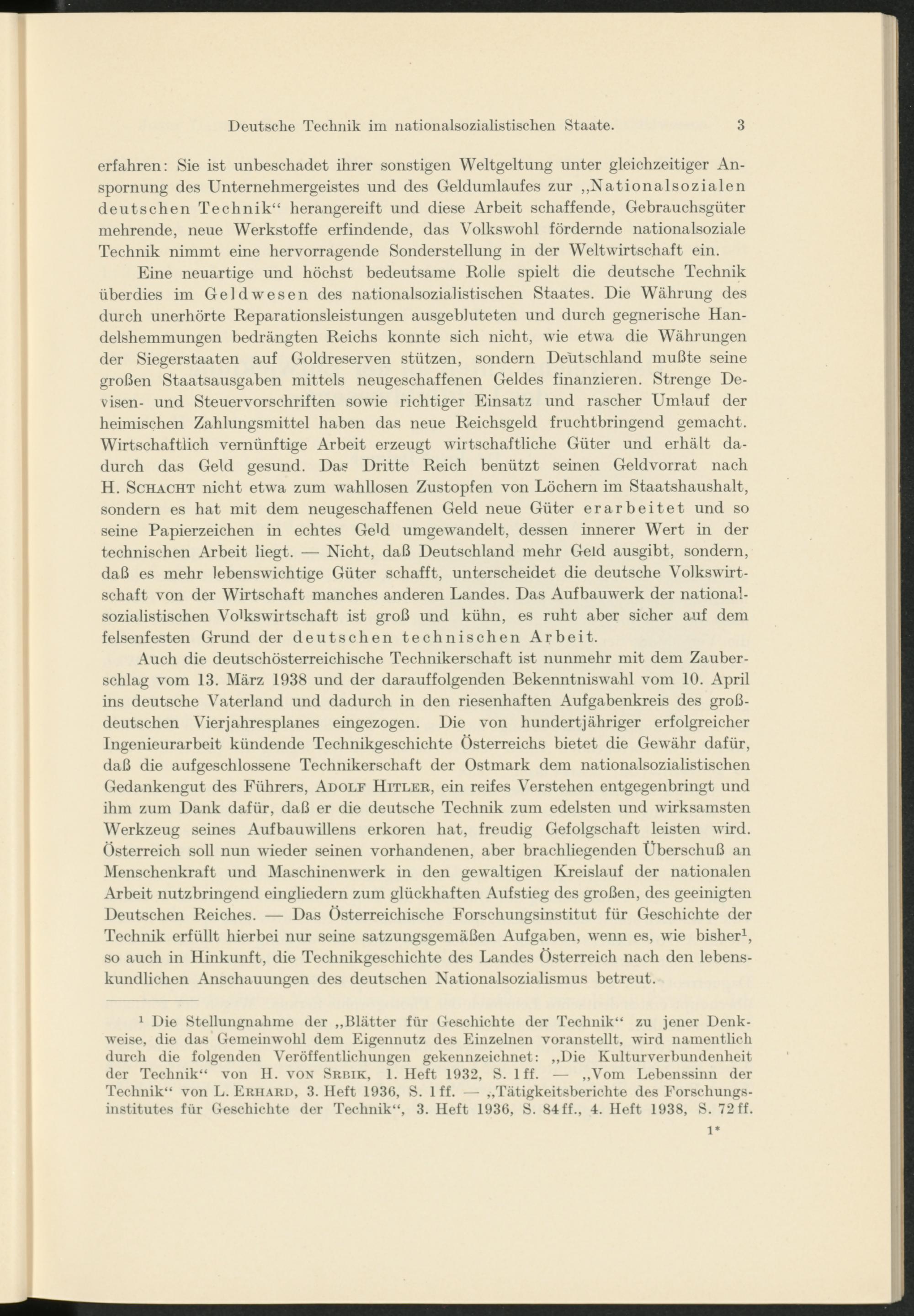 Auch die deutschösterreichische Technikerschaft ist nunmehr mit dem Zauberschlag vom 13. März 1938 und der darauffolgenden Bekenntniswahl vom 10. April ins deutsche Vaterland und dadurch in den riesenhaften Aufgabenkreis des großdeutschen Vier jahresplanes eingezogen. Die von hundertjähriger erfolgreicher Ingenieurarbeit kündende Technikgeschichte Österreichs bietet die Gewähr dafür, daß die aufgeschlossene Technikerschaft der Ostmark dem nationalsozialistischen Gedankengut des Führers, Adolf Hitler, ein reifes Verstehen entgegenbringt und ihm zum Dank dafür, daß er die deutsche Technik zum edelsten und wirksamsten Werkzeug seines Auf bau willens erkoren hat, freudig Gefolgschaft leisten wird. Österreich soll nun wieder seinen vorhandenen, aber brachliegenden Überschuß an Menschenkraft und Maschinenwerk in den gewaltigen Kreislauf der nationalen Arbeit nutzbringend eingliedern zum glückhaften Aufstieg des großen, des geeinigten Deutschen Reiches. — Das Österreichische Forschungsinstitut für Geschichte der Technik erfüllt hierbei nur seine satzungsgemäßen Aufgaben, wenn es, wie bisher 1 , so auch in Hinkunft, die Technikgeschichte des Landes Österreich nach den lebens- kundlichen Anschauungen des deutschen Nationalsozialismus betreut.