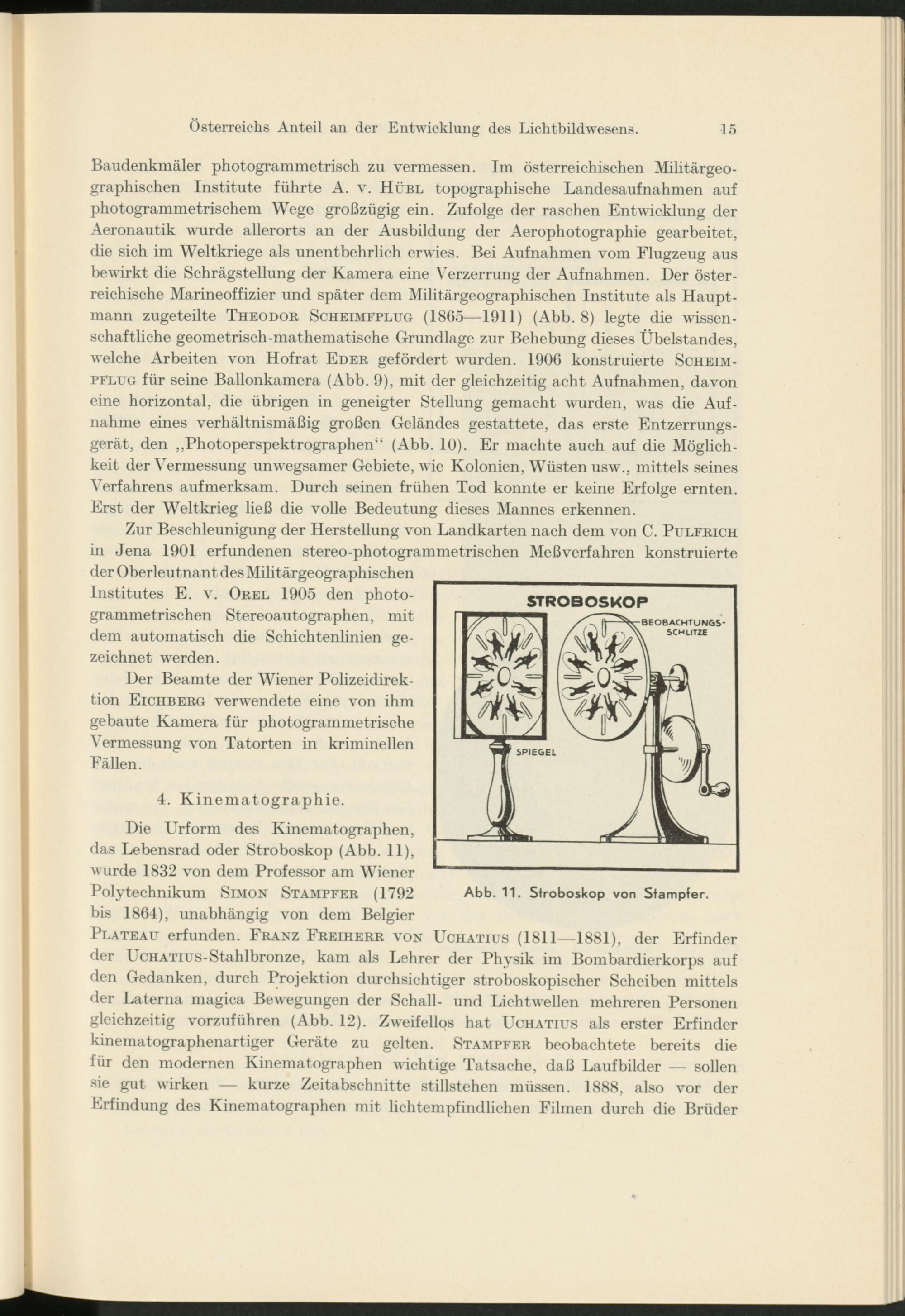 Baudenkmäler photogrammetrisch zu vermessen. Im österreichischen Militärgeographischen Institute führte A. v. Hübl topographische Landesaufnahmen auf photogrammetrischem Wege großzügig ein. Zufolge der raschen Entwicklung der Aeronautik wurde allerorts an der Ausbildung der Aerophotographie gearbeitet, die sich im Weltkriege als unentbehrlich erwies. Bei Aufnahmen vom Flugzeug aus bewirkt die Schrägstellung der Kamera eine Verzerrung der Aufnahmen. Der österreichische Marineoffizier und später dem Militärgeographischen Institute als Hauptmann zugeteilte Theodor Scheimfplug (1865—1911) (Abb. 8) legte die wissenschaftliche geometrisch-mathematische Grundlage zur Behebung dieses Ubelstandes, welche Arbeiten von Hofrat Eder gefördert wurden. 1906 konstruierte Scheim- pFlug für seine Ballonkamera (Abb. 9), mit der gleichzeitig acht Aufnahmen, davon eine horizontal, die übrigen in geneigter Stellung gemacht wurden, was die Aufnahme eines verhältnismäßig großen Geländes gestattete, das erste Entzerrungsgerät, den „Photoperspektrographen“ (Abb. 10). Er machte auch auf die Möglichkeit der Vermessung unwegsamer Gebiete, wie Kolonien, Wüsten usw., mittels seines Verfahrens aufmerksam. Durch seinen frühen Tod konnte er keine Erfolge ernten. Erst der Weltkrieg ließ die volle Bedeutung dieses Mannes erkennen.