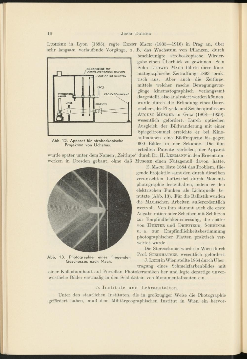 E. Mach löste 1884 das Problem, fliegende Projektile samt den durch dieselben verursachten Luftwirbel durch Momentphotographie festzuhalten, indem er den elektrischen Funken als Lichtquelle benutzte (Abb. 13). Für die Ballistik wurden die MACHschen Arbeiten außerordentlich wertvoll. Von ihm stammt auch die erste Angabe rotierender Scheiben mit Schlitzen zur Empfindlichkeitsmessung, die später von Hurter und Driffield, Scheiner u. a. zur Empfindlichkeitsbestimmung photographischer Platten praktisch verwertet wurde.