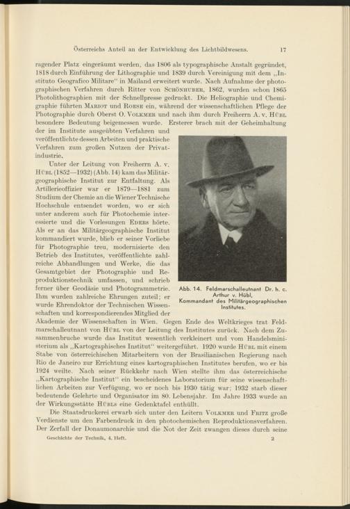 Hübl (1852—1932) (Abb. 14) kam das Militär- geographische Institut zur Entfaltung. Als Artillerieoffizier war er 1879—1881 zum Studium der Chemie an die Wiener Technische Hochschule entsendet w'orden, wo er sich unter anderem auch für Photochemie interessierte und die Vorlesungen Edees hörte.