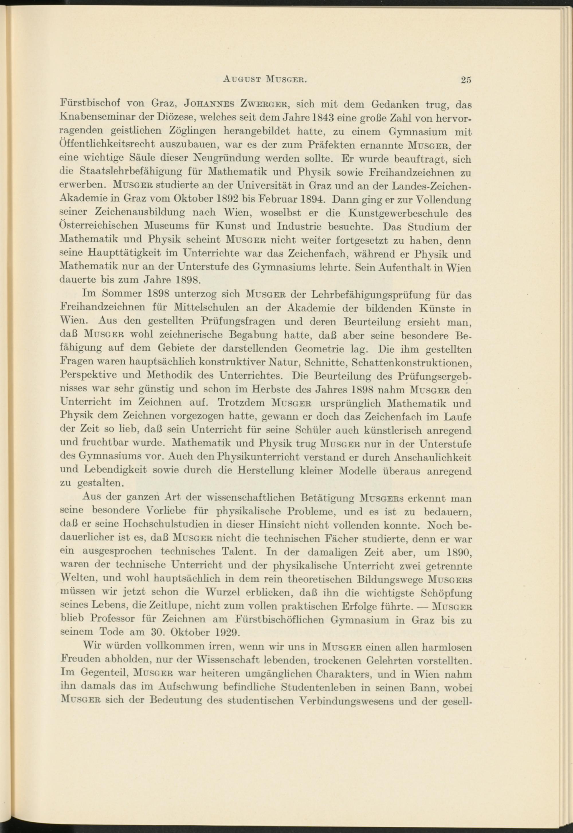 Aus der ganzen Art der wissenschaftlichen Betätigung Musgers erkennt man seine besondere Vorliebe für physikalische Probleme, und es ist zu bedauern, daß er seine Hochschulstudien in dieser Hinsicht nicht vollenden konnte. Noch bedauerlicher ist es, daß Musger nicht die technischen Fächer studierte, denn er war ein ausgesprochen technisches Talent. In der damaligen Zeit aber, um 1890, waren der technische Unterricht und der physikalische Unterricht zwei getrennte Welten, und wohl hauptsächlich in dem rein theoretischen Bildungswege Musgers müssen wir jetzt schon die Wurzel erblicken, daß ihn die wichtigste Schöpfung seines Lebens, die Zeitlupe, nicht zum vollen praktischen Erfolge führte. — Musger blieb Professor für Zeichnen am Fürstbischof liehen Gymnasium in Graz bis zu seinem Tode am 30. Oktober 1929.