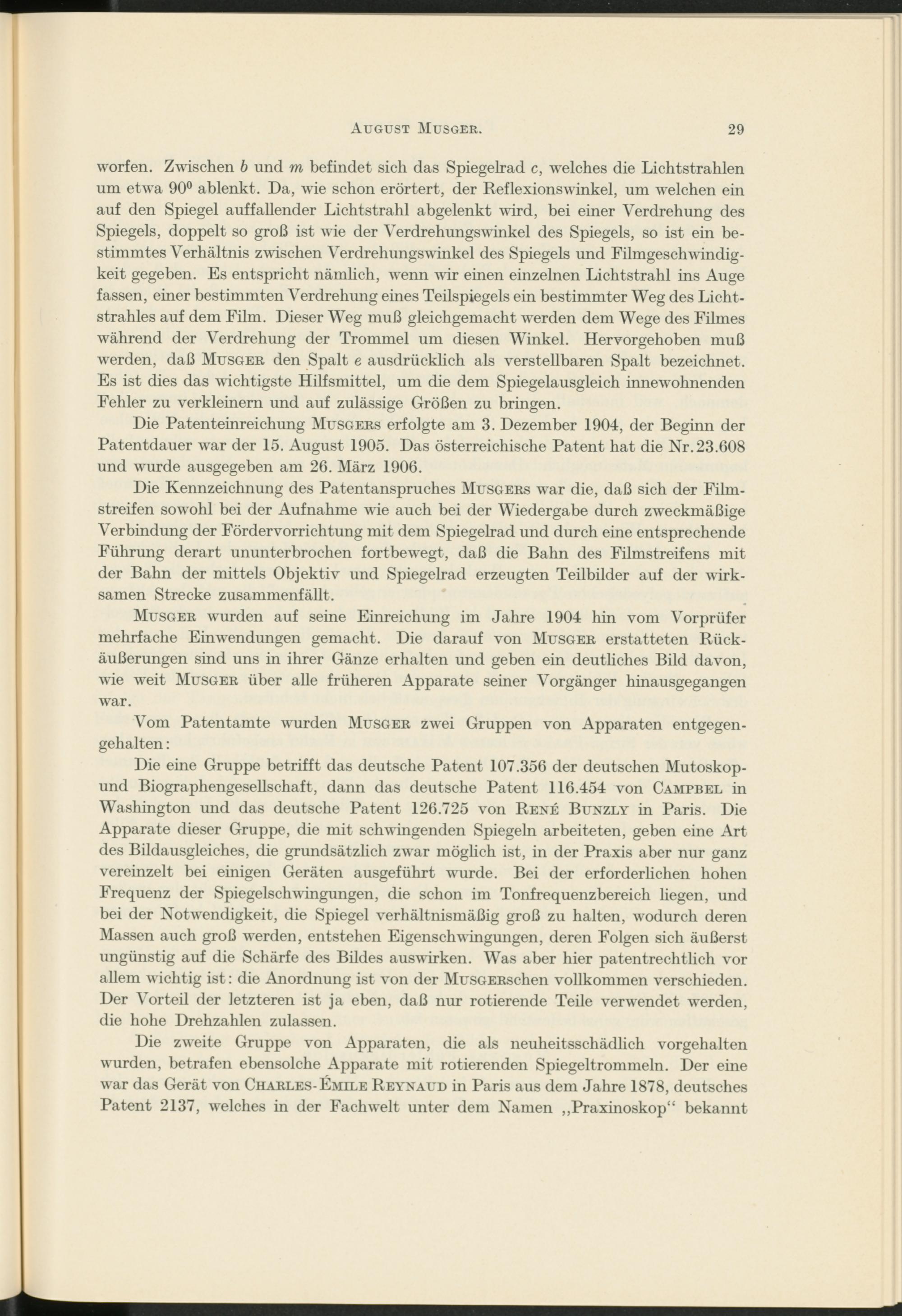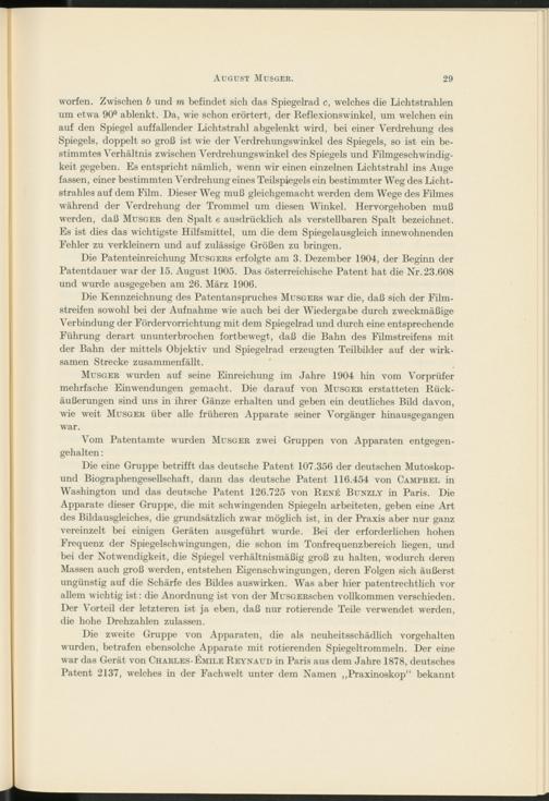 worfen. Zwischen b und m befindet sich das Spiegelrad c, welches die Lichtstrahlen um etwa 90° ablenkt. Da, wie schon erörtert, der Reflexionswinkel, um welchen ein auf den Spiegel auffallender Lichtstrahl abgelenkt wird, bei einer Verdrehung des Spiegels, doppelt so groß ist wie der Verdrehungswinkel des Spiegels, so ist ein bestimmtes Verhältnis zwischen Verdrehungswinkel des Spiegels und Filmgeschwindigkeit gegeben. Es entspricht nämlich, wenn wir einen einzelnen Lichtstrahl ins Auge fassen, einer bestimmten Verdrehung eines Teilspiegels ein bestimmter Weg des Lichtstrahles auf dem Film. Dieser Weg muß gleichgemacht werden dem Wege des Filmes während der Verdrehung der Trommel um diesen Winkel. Hervorgehoben muß werden, daß Musger den Spalt e ausdrücklich als verstellbaren Spalt bezeichnet. Es ist dies das wichtigste Hilfsmittel, um die dem Spiegelausgleich innewohnenden Fehler zu verkleinern und auf zulässige Größen zu bringen.
