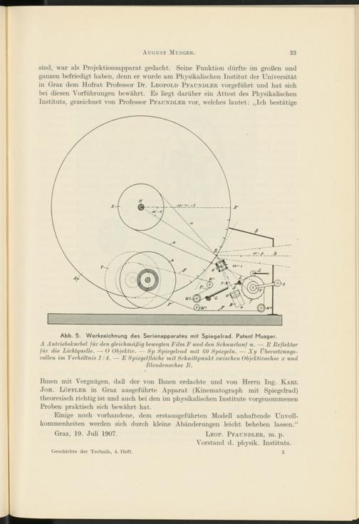 Ihnen mit Vergnügen, daß der von Ihnen erdachte und von Herrn Ing. Karl Joh. Löffler in Graz ausgeführte Apparat (Kinematograph mit Spiegelrad) theoretisch richtig ist und auch bei den im physikalischen Institute vorgenommenen Proben praktisch sich bewährt hat.