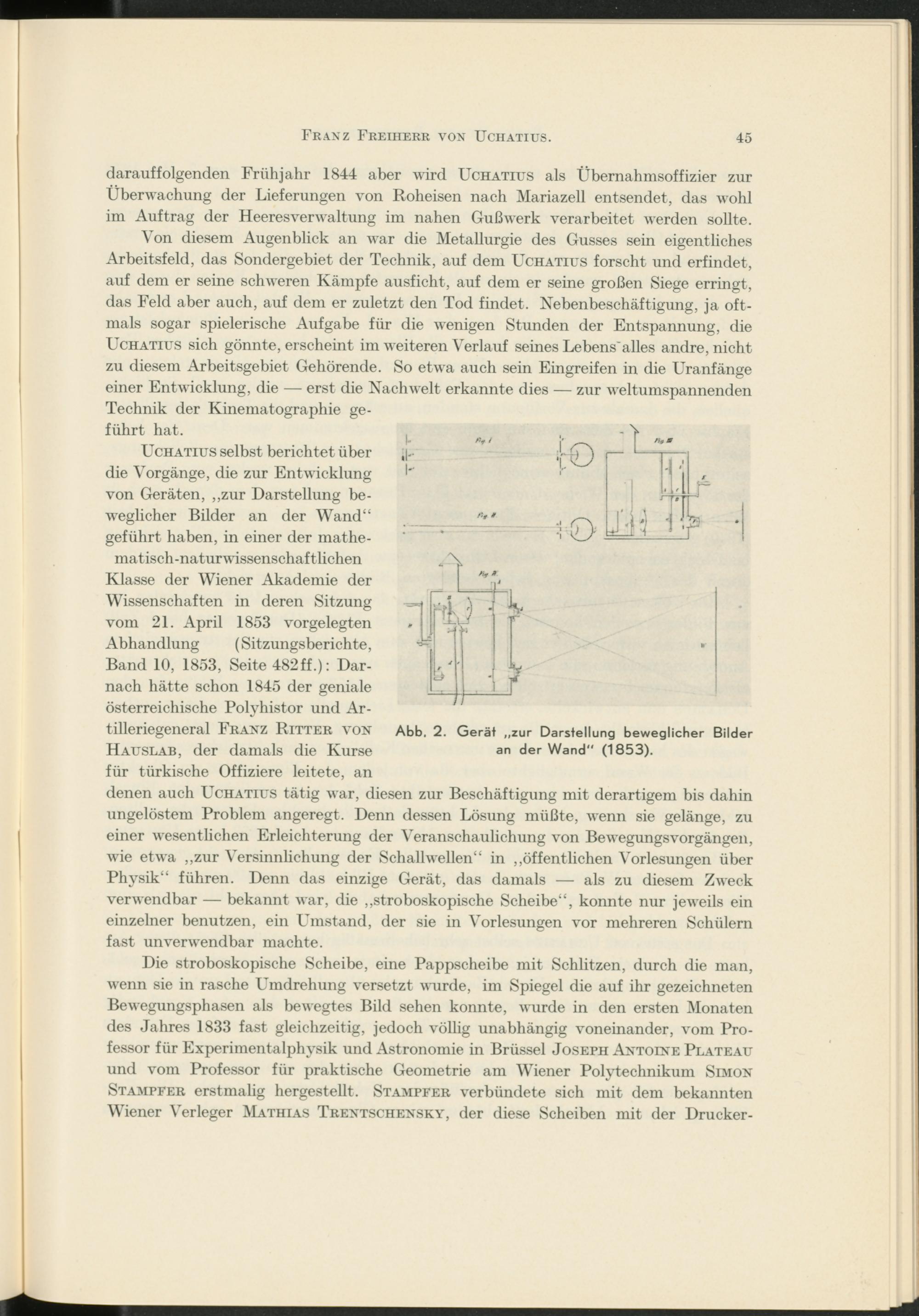 Band 10, 1853, Seite 482ff.): Darnach hätte schon 1845 der geniale österreichische Polyhistor und Artilleriegeneral Franz Ritter von Hauslab, der damals die Kurse für türkische Offiziere leitete, an denen auch Uchatius tätig war, diesen zur Beschäftigung mit derartigem bis dahin ungelöstem Problem angeregt. Denn dessen Lösung müßte, wenn sie gelänge, zu einer wesentlichen Erleichterung der Veranschaulichung von BewegungsVorgängen, wie etwa „zur Versinnlichung der Schallwellen“ in „öffentlichen Vorlesungen über Physik“ führen. Denn das einzige Gerät, das damals — als zu diesem Zweck verwendbar — bekannt war, die „stroboskopische Scheibe“, konnte nur jeweils ein einzelner benutzen, ein Umstand, der sie in Vorlesungen vor mehreren Schülern fast unverwendbar machte.
