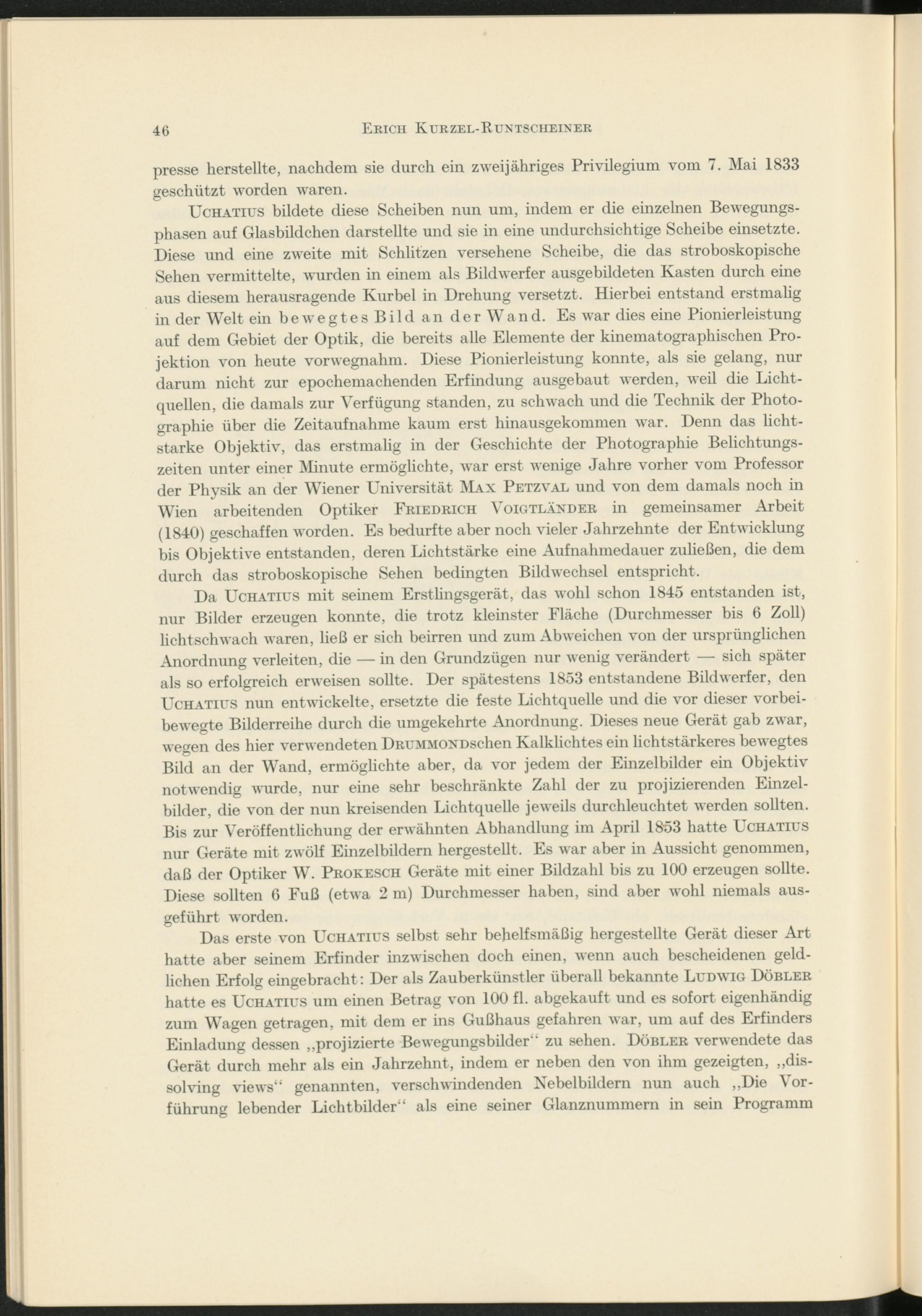 Da Uchatius mit seinem Erstlingsgerät, das wohl schon 1845 entstanden ist, nur Bilder erzeugen konnte, die trotz kleinster Fläche (Durchmesser bis 6 Zoll) lichtschwach waren, ließ er sich beirren und zum Ab weichen von der ursprünglichen Anordnung verleiten, die — in den Grundzügen nur wenig verändert — sich später als so erfolgreich erweisen sollte. Der spätestens 1853 entstandene Bildwerfer, den L t chatius nun entwickelte, ersetzte die feste Lichtquelle und die vor dieser vorbeibewegte Bilderreihe durch die umgekehrte Anordnung. Dieses neue Gerät gab zwar, wegen des hier verwendeten ÜRUMMONDschen Kalklichtes ein lichtstärkeres bewegtes Bild an der Wand, ermöglichte aber, da vor jedem der Einzelbilder ein Objektiv notwendig wurde, nur eine sehr beschränkte Zahl der zu projizierenden Einzelbilder, die von der nun kreisenden Lichtquelle jeweils durchleuchtet werden sollten. Bis zur Veröffentlichung der erwähnten Abhandlung im April 1853 hatte Uchatius nur Geräte mit zwölf Einzelbildern hergestellt. Es war aber in Aussicht genommen, daß der Optiker W. Prokesch Geräte mit einer Bildzahl bis zu 100 erzeugen sollte. Diese sollten 6 Fuß (etwa 2 m) Durchmesser haben, sind aber wohl niemals ausgeführt worden.