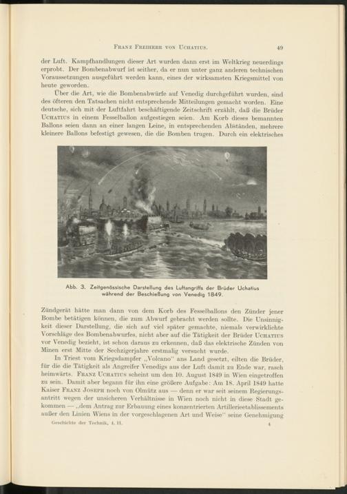 Zündgerät hätte man dann von dem Korb des Fesselballons den Zünder jener Bombe betätigen können, die zum Abwurf gebracht werden sollte. Die Unsinnig- keit dieser Darstellung, die sich auf viel später gemachte, niemals verwirklichte Vorschläge des Bombenabwurfes, nicht aber auf die Tätigkeit der Brüder Uchatius vor Venedig bezieht, ist schon daraus zu erkennen, daß das elektrische Zünden von Minen erst Mitte der Sechzigerjahre erstmaüg versucht wurde.