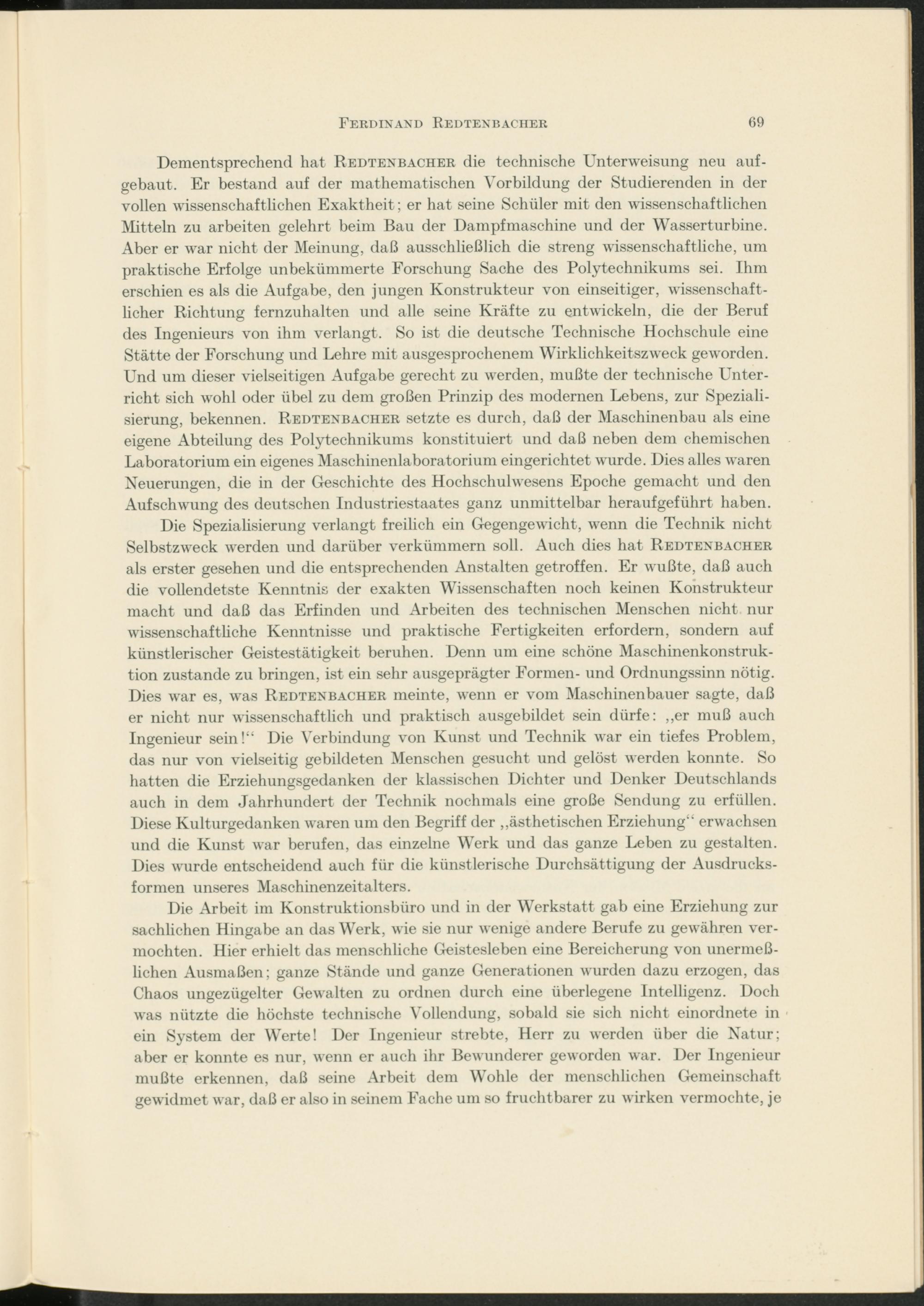 Die Spezialisierung verlangt freilich ein Gegengewicht, wenn die Technik nicht Selbstzweck werden und darüber verkümmern soll. Auch dies hat Redtenbacher als erster gesehen und die entsprechenden Anstalten getroffen. Er wußte, daß auch die vollendetste Kenntnis der exakten Wissenschaften noch keinen Konstrukteur macht und daß das Erfinden und Arbeiten des technischen Menschen nicht nur wissenschaftliche Kenntnisse und praktische Fertigkeiten erfordern, sondern auf künstlerischer Geistestätigkeit beruhen. Denn um eine schöne Maschinenkonstruktion zustande zu bringen, ist ein sehr ausgeprägter Formen- und Ordnungssinn nötig. Dies w r ar es, was Redtenbacher meinte, wenn er vom Maschinenbauer sagte, daß er nicht nur wissenschaftlich und praktisch ausgebildet sein dürfe: „er muß auch Ingenieur sein!“ Die Verbindung von Kunst und Technik war ein tiefes Problem, das nur von vielseitig gebildeten Menschen gesucht und gelöst werden konnte. So hatten die Erziehungsgedanken der klassischen Dichter und Denker Deutschlands auch in dem Jahrhundert der Technik nochmals eine große Sendung zu erfüllen. Diese Kulturgedanken waren um den Begriff der „ästhetischen Erziehung“ erwachsen und die Kunst war berufen, das einzelne Werk und das ganze Leben zu gestalten. Dies wurde entscheidend auch für die künstlerische Durchsättigung der Ausdrucksformen unseres Maschinenzeitalters.