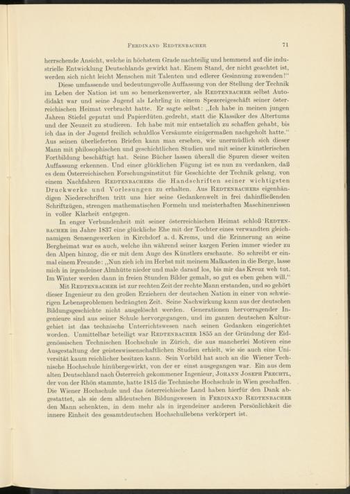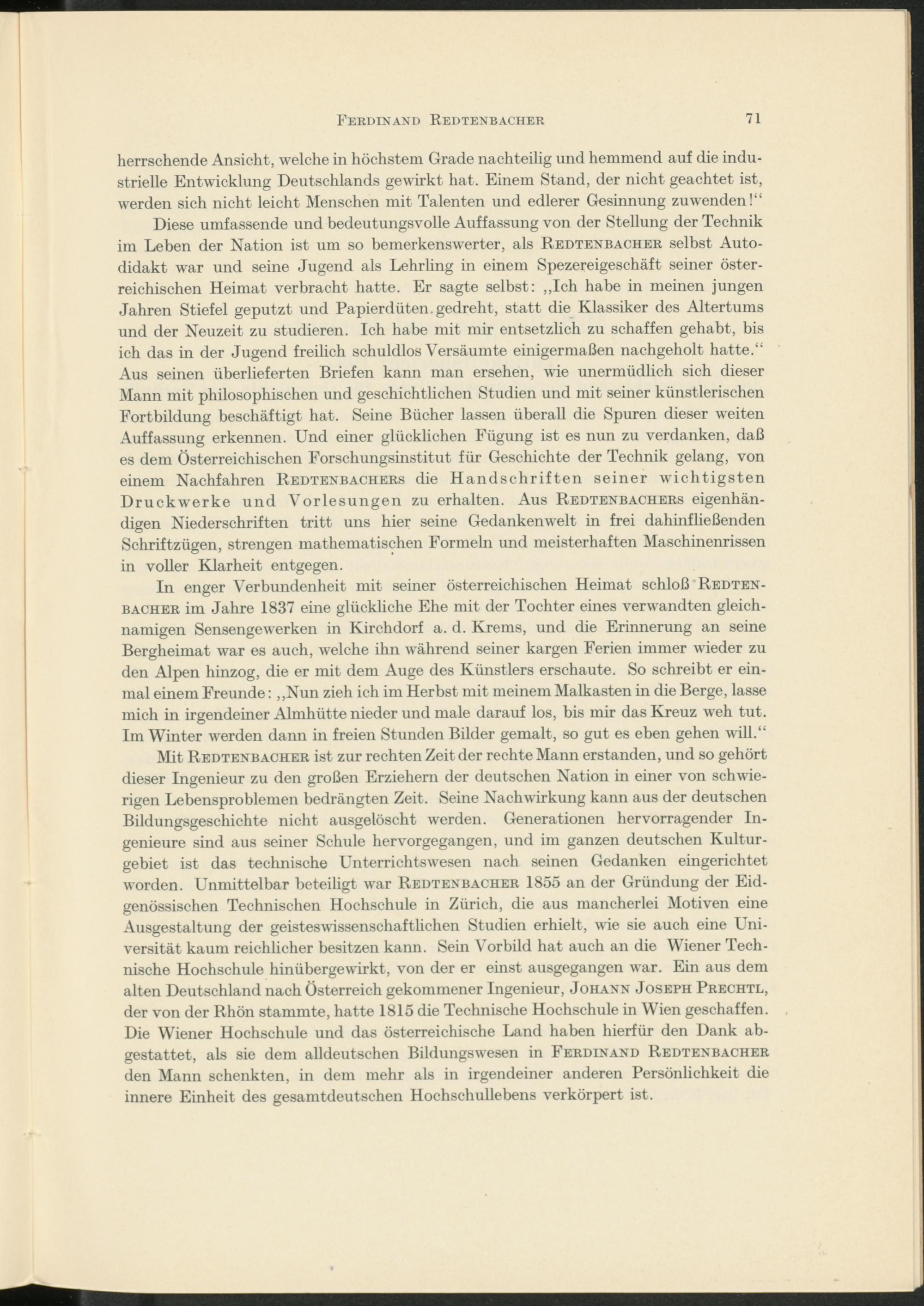 Mit Redtenbacher ist zur rechten Zeit der rechte Mann erstanden, und so gehört dieser Ingenieur zu den großen Erziehern der deutschen Nation in einer von schwierigen Lebensproblemen bedrängten Zeit. Seine Nachwirkung kann aus der deutschen Bildungsgeschichte nicht ausgelöscht werden. Generationen hervorragender Ingenieure sind aus seiner Schule hervorgegangen, und im ganzen deutschen Kulturgebiet ist das technische Unterrichtsw r esen nach seinen Gedanken eingerichtet worden. Unmittelbar beteiligt w r ar Redtenbacher 1855 an der Gründung der Eidgenössischen Technischen Hochschule in Zürich, die aus mancherlei Motiven eine Ausgestaltung der geisteswissenschaftlichen Studien erhielt, w r ie sie auch eine Universität kaum reichlicher besitzen kann. Sein Vorbild hat auch an die Wiener Technische Hochschule hinübergewdrkt, von der er einst ausgegangen war. Ein aus dem alten Deutschland nach Österreich gekommener Ingenieur, Johann Joseph Prechtl, der von der Rhön stammte, hatte 1815 die Technische Hochschule in Wien geschaffen. Die Wiener Hochschule und das österreichische Land haben hierfür den Dank abgestattet, als sie dem alldeutschen Bildungswesen in Ferdinand Redtenbacher den Mann schenkten, in dem mehr als in irgendeiner anderen Persönlichkeit die innere Einheit des gesamtdeutschen Hochschullebens verkörpert ist.