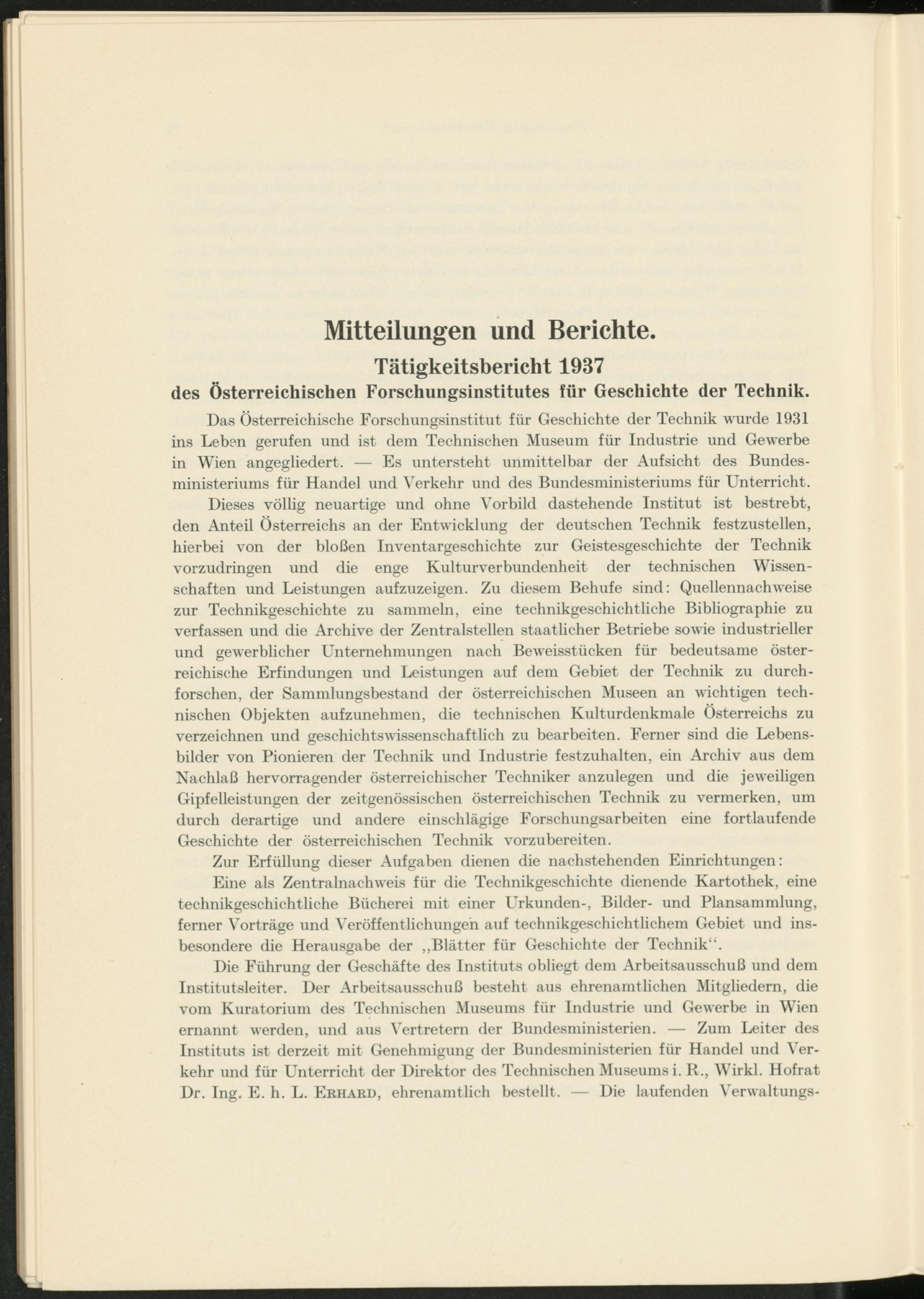 Die Führung der Geschäfte des Instituts obliegt dem Arbeitsausschuß und dem Institutsleiter. Der Arbeitsausschuß besteht aus ehrenamtlichen Mitgliedern, die vom Kuratorium des Technischen Museums für Industrie und Gewerbe in Wien ernannt werden, und aus Vertretern der Bundesministerien. — Zum Leiter des Instituts ist derzeit mit Genehmigung der Bundesministerien für Handel und Verkehr und für Unterricht der Direktor des Technischen Museums i. R., Wirkl. Hofrat Dr. Ing. E. h. L. Erhard, ehrenamtlich bestellt. — Die laufenden Verwaltungs-