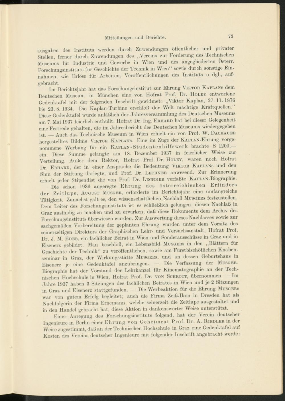 Die schon 1936 angeregte Ehrung des österreichischen Erfinders der Zeitlupe, August Musger, erforderte im Berichtsjahr eine umfangreiche Tätigkeit. Zunächst galt es, den wissenschaftlichen Nachlaß Musgers festzustellen. Dem Leiter des Forschungsinstituts ist es schließlich gelungen, diesen Nachlaß in Graz ausfindig zu machen und zu erwirken, daß diese Dokumente dem Archiv des Forschungsinstituts überwiesen wurden. Zur Auswertung dieses Nachlasses sowie zur sachgemäßen Vorbereitung der geplanten Ehrung wurden unter dem Vorsitz des seinerzeitigen Direktors der Graphischen Lehr- und Versuchsanstalt, Hofrat Prof. Dr. J. M. Eder, ein fachlicher Beirat in Wien und Sonderausschüsse in Graz und in Eisenerz gebildet. Man beschloß, ein Lebensbild Musgers in den „Blättern für Geschichte der Technik“ zu veröffentlichen, sowie am Fürstbischöflichen Knabenseminar in Graz, der Wirkungsstätte Musgers, und an dessen Geburtshaus in Eisenerz je eine Gedenktafel anzubringen. — Die Verfassung der Musger- Biographie hat der Vorstand der Lehrkanzel für Kinematographie an der Technischen Hochschule in Wien, Hofrat Prof. Dr. von Schrott, übernommen. — Im Jahre 1937 haben 3 Sitzungen des fachlichen Beirates in Wien und je 2 Sitzungen in Graz und Eisenerz stattgefunden. — Die Werbeaktion für die Ehrung Musgers war von gutem Erfolg begleitet; auch die Firma Zeiß-Ikon in Dresden hat als Nachfolgerin der Firma Ernemann, welche seinerzeit die Zeitlupe ausgestaltet und in den Handel gebracht hat, diese Aktion in dankenswerter Weise unterstützt.