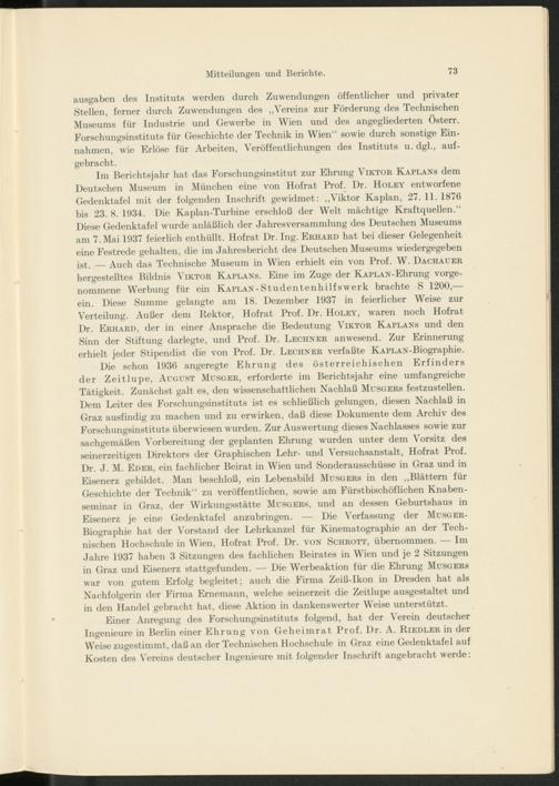 Im Berichtsjahr hat das Forschungsinstitut zur Ehrung Viktor Kaplans dem Deutschen Museum in München eine von Hofrat Prof. Dr. Holey entworfene Gedenktafel mit der folgenden Inschrift gewidmet: „Viktor Kaplan, 27. 11. 1876 bis 23. 8. 1934. Die Kaplan-Turbine erschloß der Welt mächtige Kraftquellen.“ Diese Gedenktafel wurde anläßlich der Jahresversammlung des Deutschen Museums am 7. Mai 1937 feierlich enthüllt. Hofrat Dr. Ing. Erhard hat bei dieser Gelegenheit eine Festrede gehalten, die im Jahresbericht des Deutschen Museums wiedergegeben ist. — Auch das Technische Museum in Wien erhielt ein von Prof. W. Dachauer hergestelltes Bildnis Viktor Kaplans. Eine im Zuge der KAPLAN-Ehrung vorgenommene Werbung für ein Kaplan- Studentenhilfswerk brachte S 1200,— ein. Diese Summe gelangte am 18. Dezember 1937 in feierlicher Weise zur Verteilung. Außer dem Rektor, Hofrat Prof. Dr. Holey, waren noch Hofrat Dr. Erhard, der in einer Ansprache die Bedeutung Viktor Kaplans und den Sinn der Stiftung darlegte, und Prof. Dr. Lechner anwesend. Zur Erinnerung erhielt jeder Stipendist die von Prof. Dr. Lechner verfaßte Kaplan -Biographie.