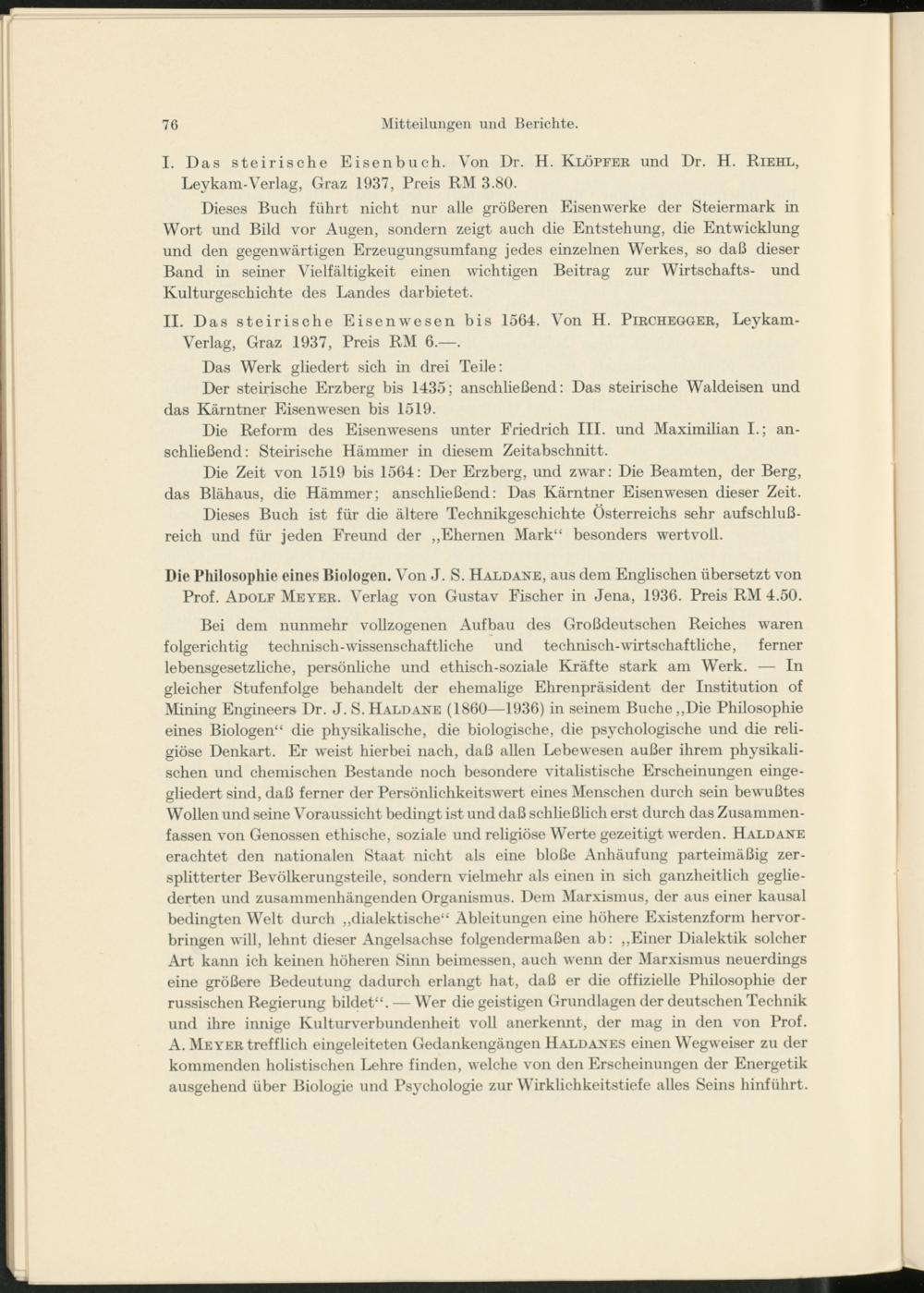 I. Das steirische Eisenbuch. Von Dr. H. Klopfer und Dr. H. Riehl, Ley kam-Verlag, Graz 1937, Preis RM 3.80.