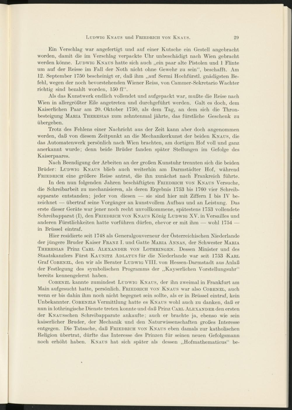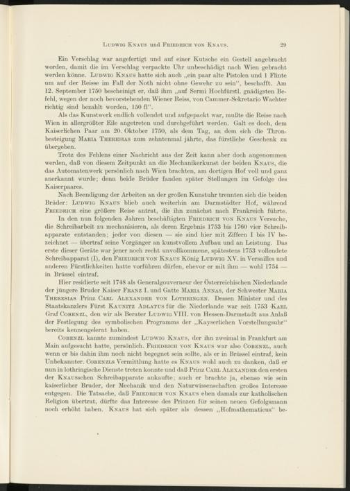 Cobenzl kannte zumindest Ludwig Knaus, der ihn zweimal in Frankfurt am Main auf gesucht hatte, persönlich. Friedrich von Knaus war also Cobenzl, auch wenn er bis dahin ihm noch nicht begegnet sein sollte, als er in Brüssel eintraf, kein Unbekannter. Cobenzls Vermittlung hatte es Knaus wohl auch zu danken, daß er nun in lothringische Dienste treten konnte und daß Prinz Carl Alexander den ersten der KNAUSschen Schreibapparate ankaufte; auch er brachte ja, ebenso wie sein kaiserlicher Bruder, der Mechanik und den Naturwissenschaften großes Interesse entgegen. Die Tatsache, daß Friedrich von Knaus eben damals zur katholischen Religion übertrat, dürfte das Interesse des Prinzen für seinen neuen Gefolgsmann noch erhöht haben. Knaus hat sich später als dessen „Hofmathematicus“ be-