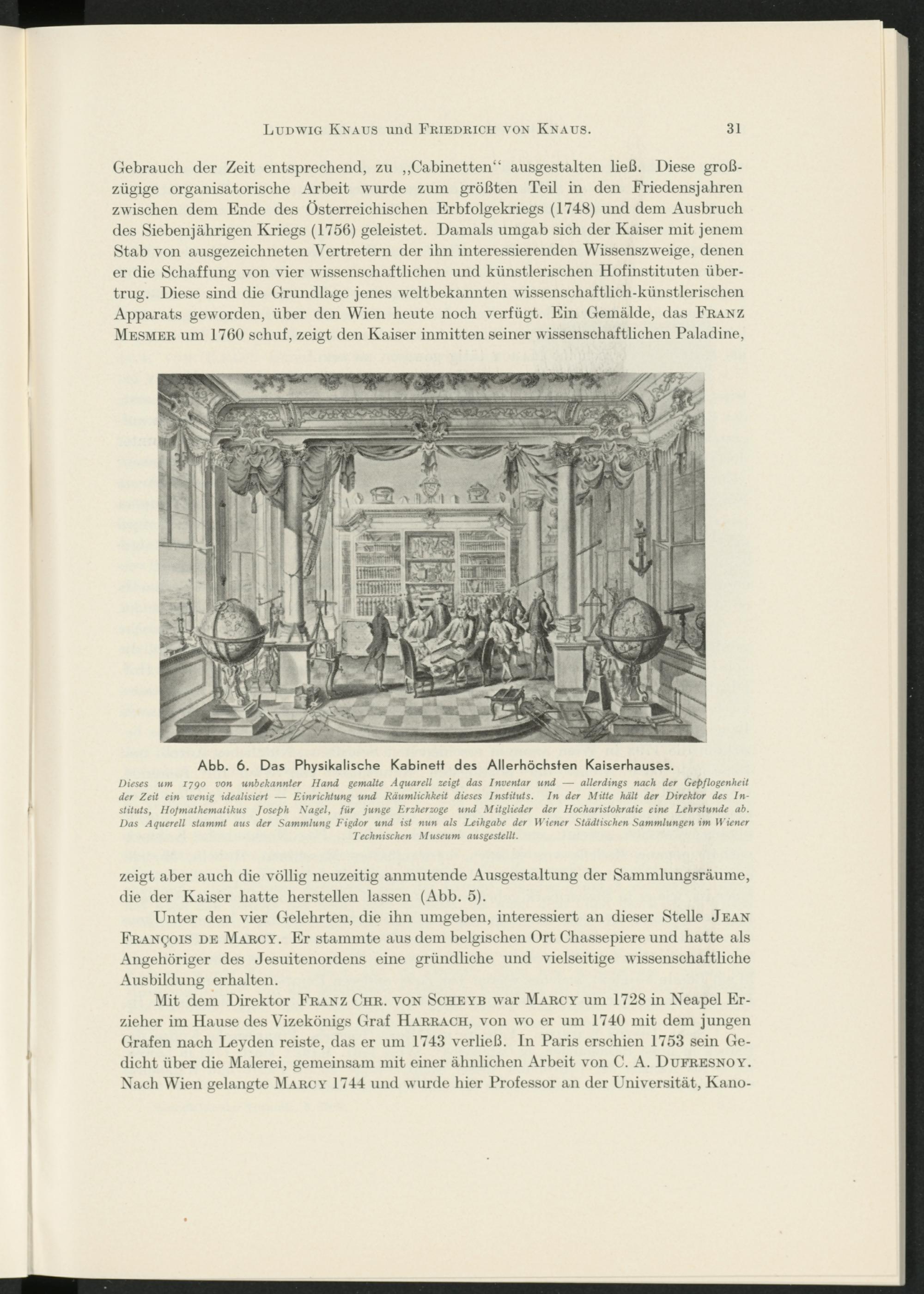 Gebrauch der Zeit entsprechend, zu „Cabinetten“ ausgestalten ließ. Diese großzügige organisatorische Arbeit wurde zum größten Teil in den Friedens]ahren zwischen dem Ende des Österreichischen Erbfolgekriegs (1748) und dem Ausbruch des Siebenjährigen Kriegs (1756) geleistet. Damals umgab sich der Kaiser mit jenem Stab von ausgezeichneten Vertretern der ihn interessierenden Wissenszweige, denen er die Schaffung von vier wissenschaftlichen und künstlerischen Hofinstituten übertrug. Diese sind die Grundlage jenes weltbekannten wissenschaftlich-künstlerischen Apparats geworden, über den Wien heute noch verfügt. Ein Gemälde, das Franz Mesmer um 1760 schuf, zeigt den Kaiser inmitten seiner wissenschaftlichen Paladine,