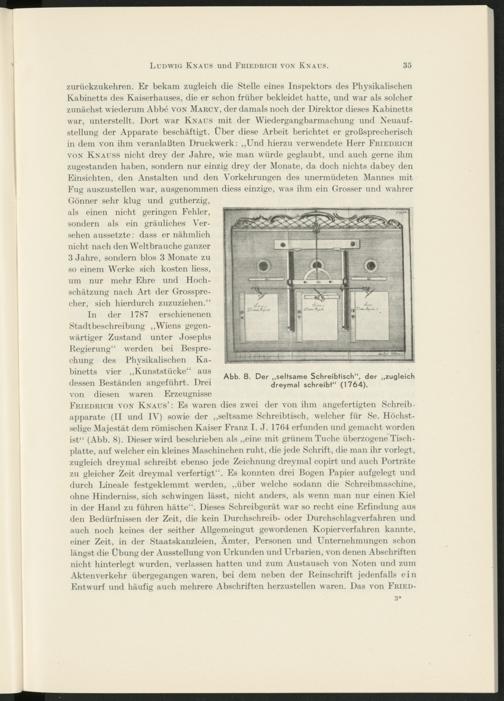 In der 1787 erschienenen Stadtbeschreibung „Wiens gegenwärtiger Zustand unter Josephs Regierung“ werden bei Besprechung des Physikalischen Kabinetts vier „Kunststücke“ aus dessen Beständen angeführt. Drei von diesen waren Erzeugnisse Friedrich von Knaus’: Es waren dies zwei der von ihm angefertigten Schreib - apparate (II und IV) sowie der „seltsame Schreibtisch, welcher für Se. Höchstselige Majestät dem römischen Kaiser Franz I. J. 1764 erfunden und gemacht worden ist“ (Abb. 8). Dieser wird beschrieben als „eine mit grünem Tuche überzogene Tischplatte, auf welcher ein kleines Maschinchen ruht, die jede Schrift, die man ihr vorlegt, zugleich drevmal schreibt ebenso jede Zeichnung dreymal copirt und auch Porträte zu gleicher Zeit dreymal verfertigt“. Es konnten drei Bogen Papier aufgelegt und durch Lineale festgeklemmt werden, „über welche sodann die Schreibmaschine, ohne Hinderniss, sich schwingen lässt, nicht anders, als wenn man nur einen Kiel in der Hand zu führen hätte“. Dieses Schreibgerät war so recht eine Erfindung aus den Bedürfnissen der Zeit, die kein Durchschreib- oder Durchschlagverfahren und auch noch keines der seither Allgemeingut gewordenen Kopierverfahren kannte, einer Zeit, in der Staatskanzleien, Ämter, Personen und Unternehmungen schon längst die Übung der Ausstellung von Urkunden und Urbarien, von denen Abschriften nicht hinterlegt wurden, verlassen hatten und zum Austausch von Noten und zum Aktenverkehr übergegangen waren, bei dem neben der Reinschrift jedenfalls ein Entwurf und häufig auch mehrere Abschriften herzustellen waren. Das von Fried-