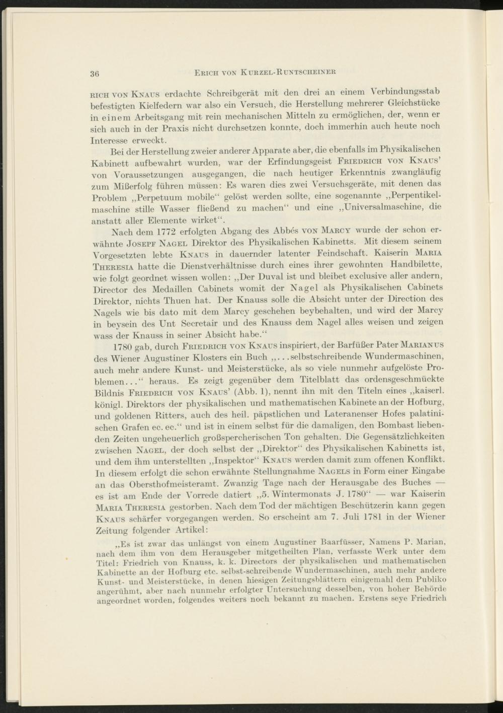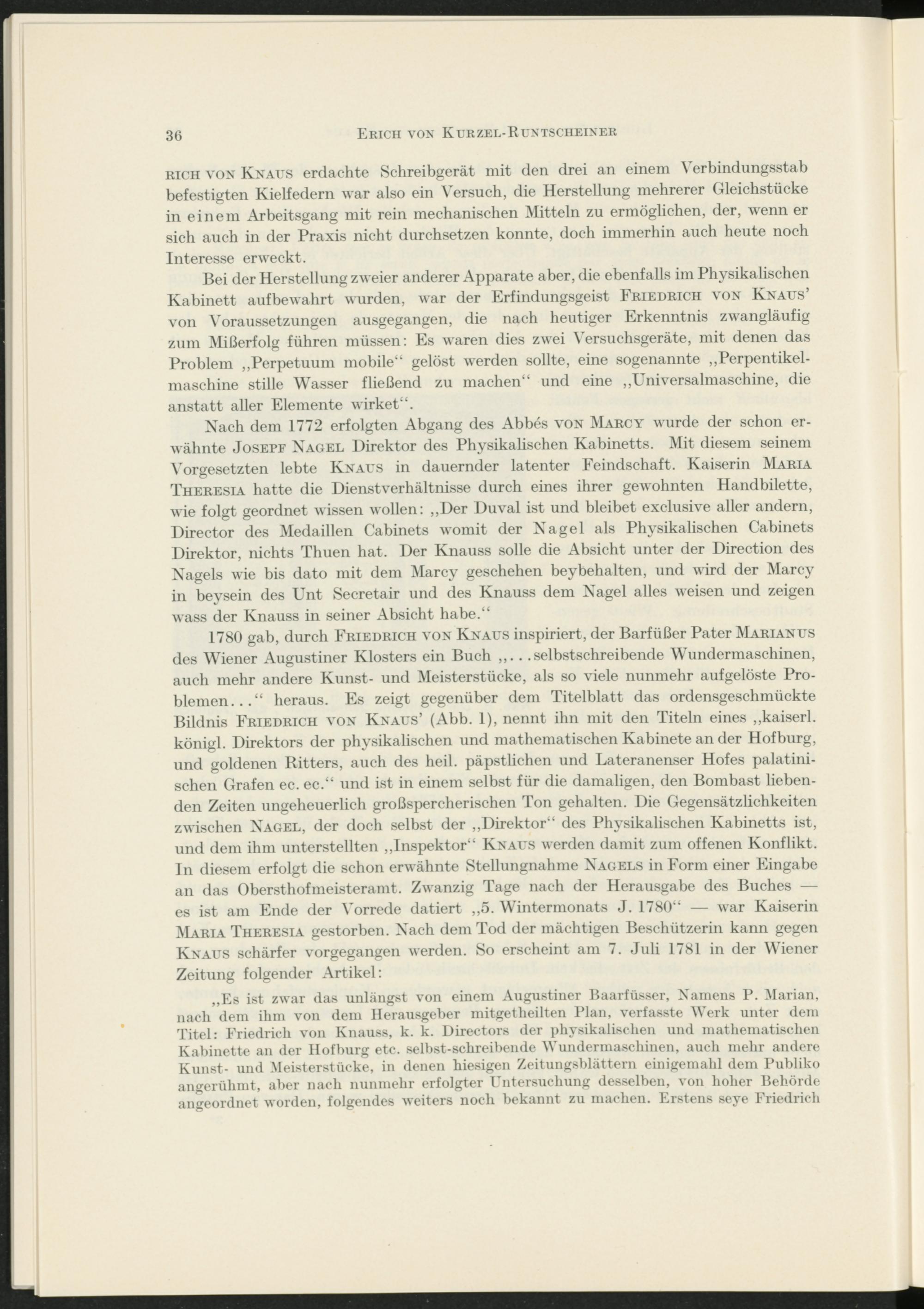 1780 gab, durch Friedrich von Knaus inspiriert, der Barfüßer Pater Marianus des Wiener Augustiner Klosters ein Buch ,,. . .selbstschreibende Wundermaschinen, auch mehr andere Kunst- und Meisterstücke, als so viele nunmehr aufgelöste Problemen...“ heraus. Es zeigt gegenüber dem Titelblatt das ordensgeschmückte Bildnis Friedrich von Knaus’ (Abb. I), nennt ihn mit den Titeln eines „kaiserl. königl. Direktors der physikalischen und mathematischen Kabinete an der Hofburg, und goldenen Kitters, auch des heil, päpstlichen und Lateranenser Hofes palatini- schen Grafen ec. ec.“ und ist in einem selbst für die damaligen, den Bombast liebenden Zeiten ungeheuerlich großspercherischen Ton gehalten. Die Gegensätzlichkeiten zwischen Nagel, der doch selbst der „Direktor“ des Physikalischen Kabinetts ist, und dem ihm unterstellten „Inspektor“ Knaus werden damit zum offenen Konflikt, ln diesem erfolgt die schon erwähnte Stellungnahme Nagels in Form einer Eingabe an das Obersthofmeisteramt. Zwanzig Tage nach der Herausgabe des Buches — es ist am Ende der Vorrede datiert „5. Wintermonats J. 1780“ — war Kaiserin Maria Theresia gestorben. Nach dem Tod der mächtigen Beschützerin kann gegen Knaus schärfer vorgegangen werden. So erscheint am 7. Juli 1781 in der Wiener Zeitung folgender Artikel: