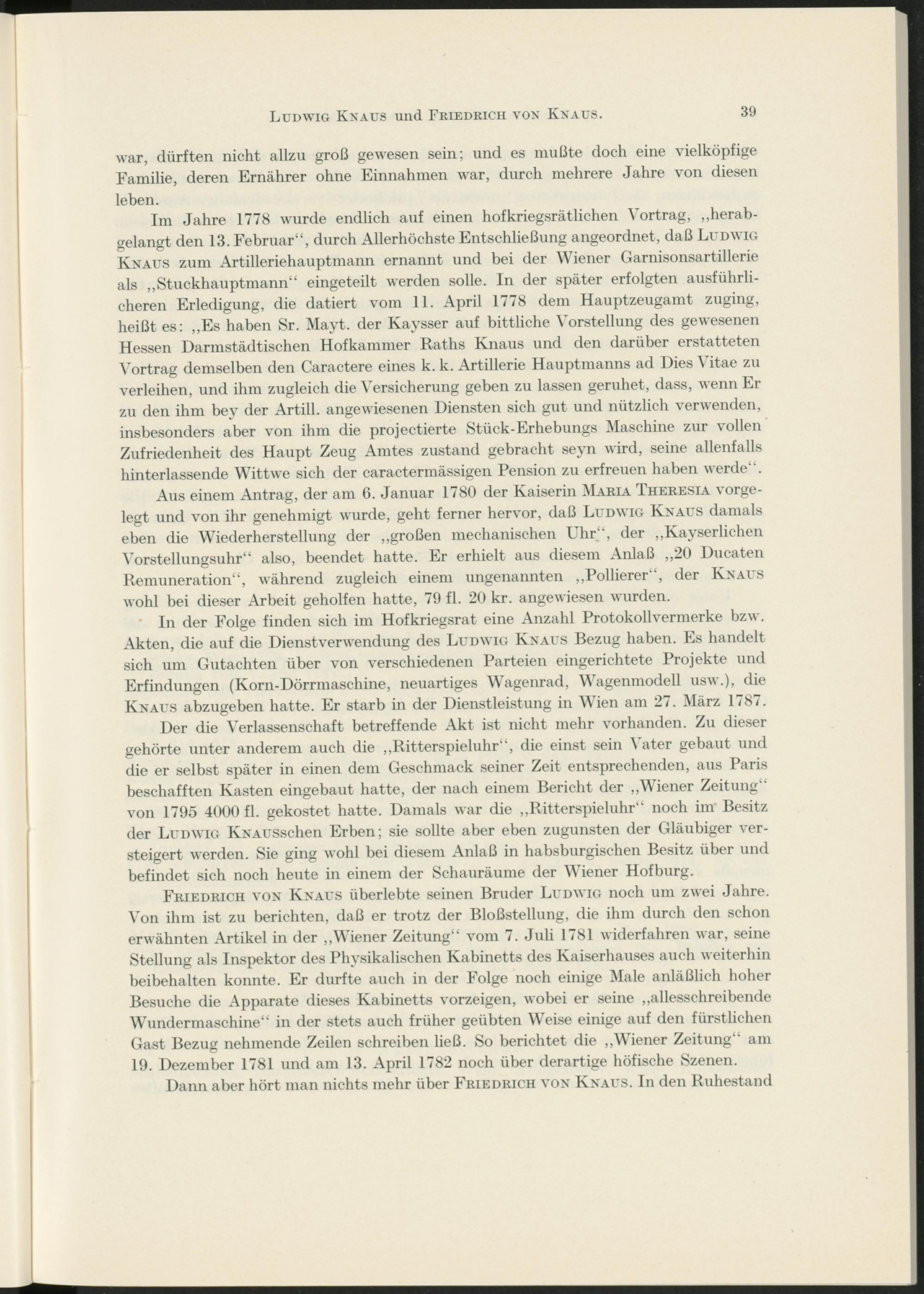 Aus einem Antrag, der am 6. Januar 1780 der Kaiserin Maria Theresia vorgelegt und von ihr genehmigt wurde, geht ferner hervor, daß Ludwig Knaus damals eben die Wiederherstellung der „großen mechanischen Uhr“, der „Kayserlichen Vorstellungsuhr“ also, beendet hatte. Er erhielt aus diesem Anlaß „20 Ducaten Remuneration“, während zugleich einem ungenannten „Pollierer“, der Knaus wohl bei dieser Arbeit geholfen hatte, 79 fl. 20 kr. angewiesen wurden.