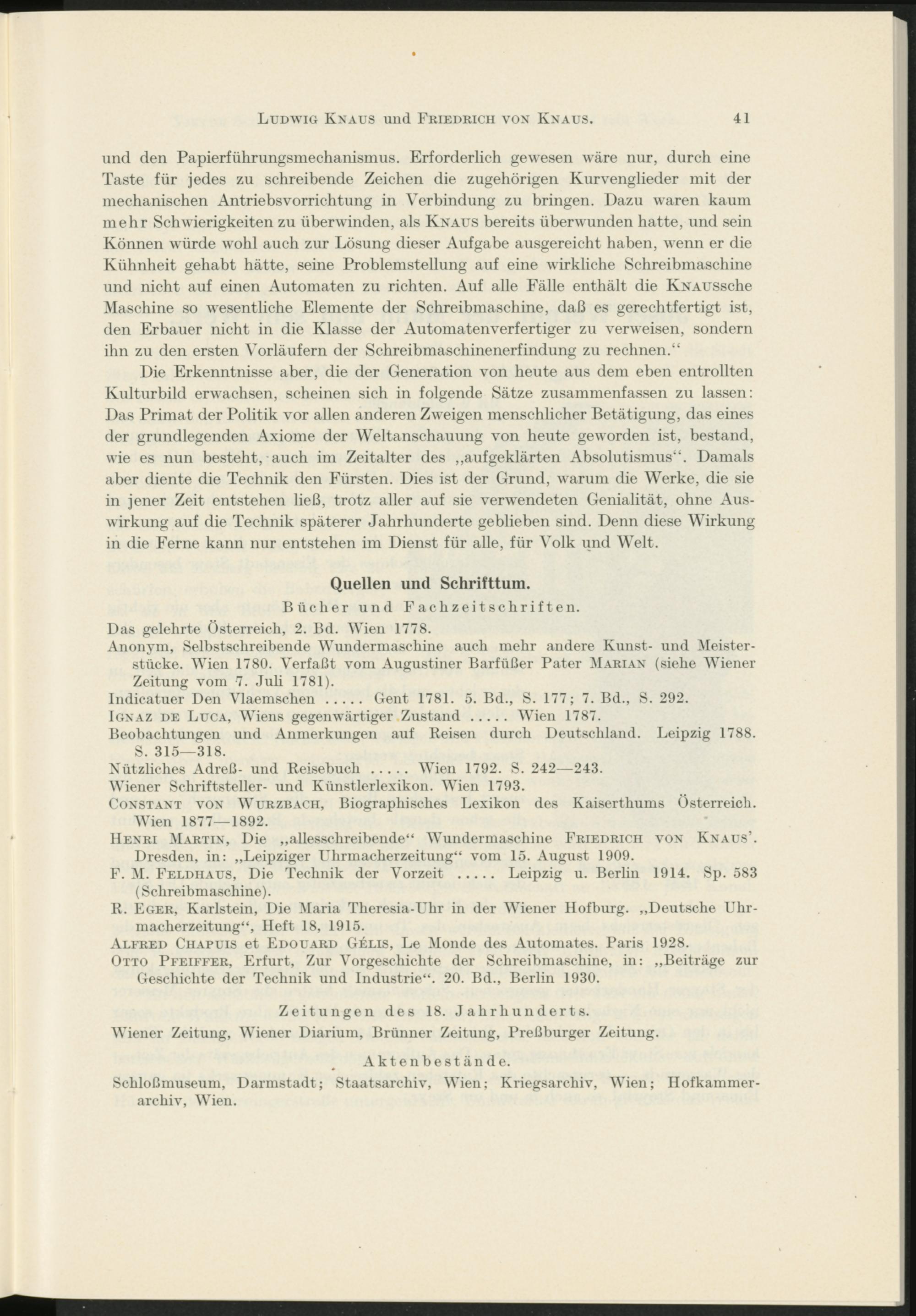 und den Papierführungsmechanismus. Erforderlich gewesen wäre nur, durch eine Taste für jedes zu schreibende Zeichen die zugehörigen Kurvenglieder mit der mechanischen Antriebsvorrichtung in Verbindung zu bringen. Dazu waren kaum mehr Schwierigkeiten zu überwinden, als Knaus bereits überwunden hatte, und sein Können würde wohl auch zur Lösung dieser Aufgabe ausgereicht haben, wenn er die Kühnheit gehabt hätte, seine Problemstellung auf eine wirkliche Schreibmaschine und nicht auf einen Automaten zu richten. Auf alle Fälle enthält die KNAUSsche Maschine so wesentliche Elemente der Schreibmaschine, daß es gerechtfertigt ist, den Erbauer nicht in die Klasse der Automatenverfertiger zu verweisen, sondern ihn zu den ersten Vorläufern der Schreibmaschinenerfindung zu rechnen.“
