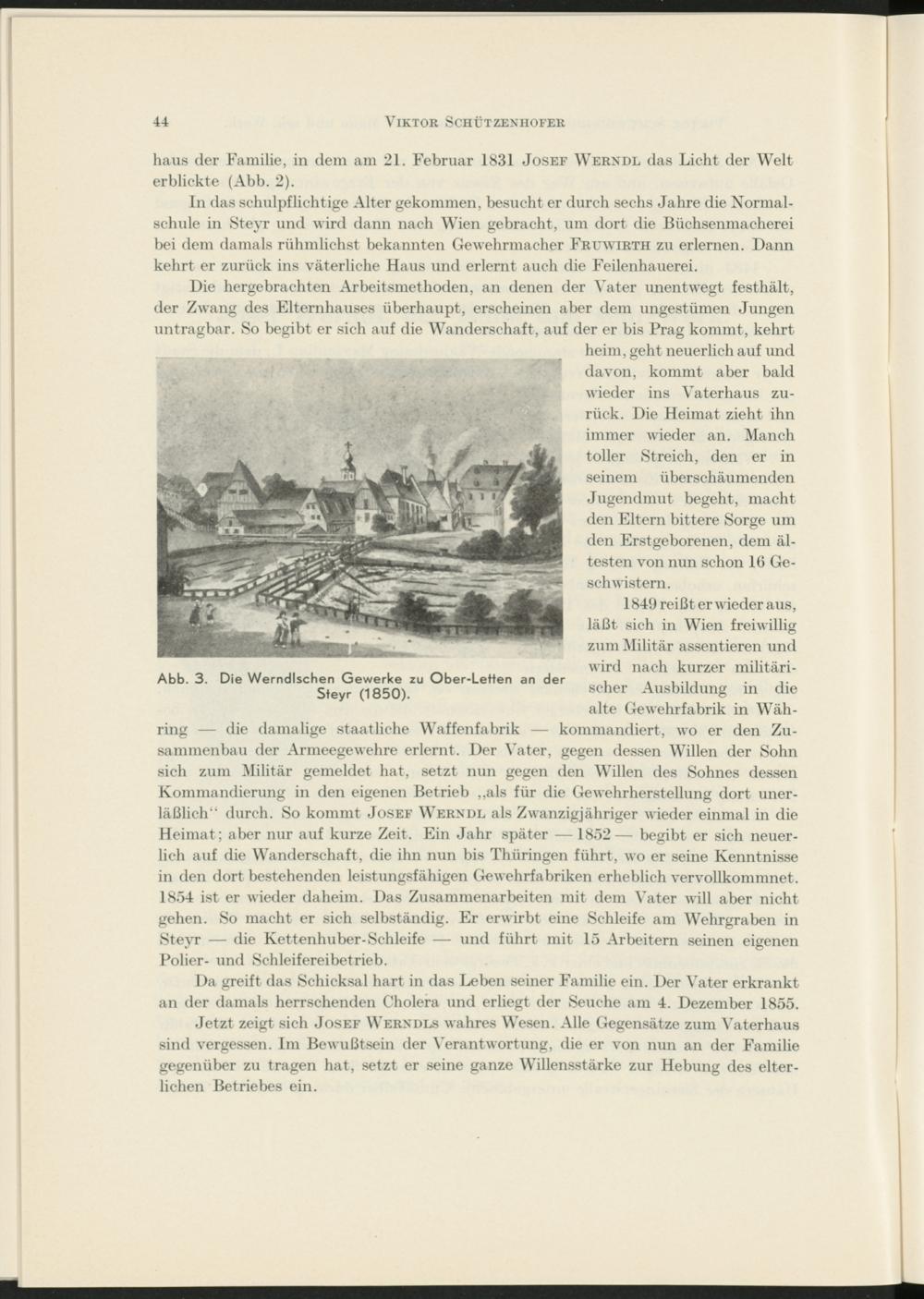 1849 reißt er wieder aus, läßt sich in Wien freiwillig zum Militär assentieren und wird nach kurzer militärischer Ausbildung in die alte Gewehrfabrik in Währing — die damalige staatliche Waffenfabrik — kommandiert, wo er den Zusammenbau der Armeegewehre erlernt. Der Vater, gegen dessen Willen der Sohn sich zum Militär gemeldet hat, setzt nun gegen den Willen des Sohnes dessen Kommandierung in den eigenen Betrieb „als für die Gewehrherstellung dort unerläßlich“ durch. So kommt Josef Werndl als Zwanzigjähriger wieder einmal in die Heimat; aber nur auf kurze Zeit. Ein Jahr später — 1852— begibt er sich neuerlich auf die Wanderschaft, die ihn nun bis Thüringen führt, wo er seine Kenntnisse in den dort bestehenden leistungsfähigen Gewehrfabriken erheblich vervollkommnet. 1854 ist er wieder daheim. Das Zusammenarbeiten mit dem Vater will aber nicht gehen. So macht er sich selbständig. Er erwirbt eine Schleife am Wehrgraben in Steyr — die Kettenhuber-Schleife — und führt mit 15 Arbeitern seinen eigenen Polier- und Schleifereibetrieb.