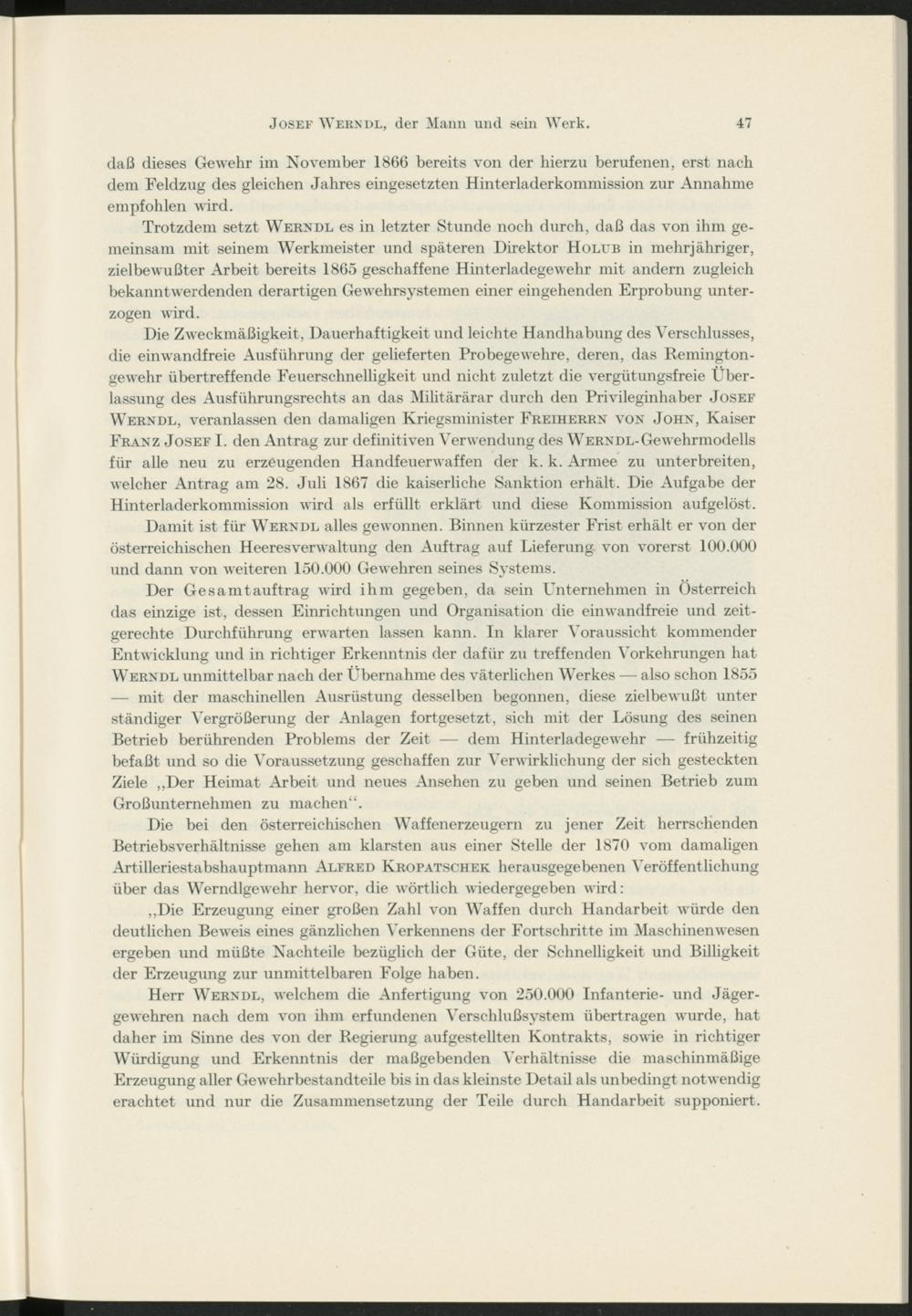 Herr Werndl, welchem die Anfertigung von 250.000 Infanterie- und Jägergewehren nach dem von ihm erfundenen Verschlußsystem übertragen wurde, hat daher im Sinne des von der Regierung aufgestellten Kontrakts, sowie in richtiger Würdigung und Erkenntnis der maßgebenden Verhältnisse die maschinmäßige Erzeugung aller Gewehrbestandteile bis in das kleinste Detail als unbedingt notwendig erachtet und nur die Zusammensetzung der Teile durch Handarbeit supponiert.