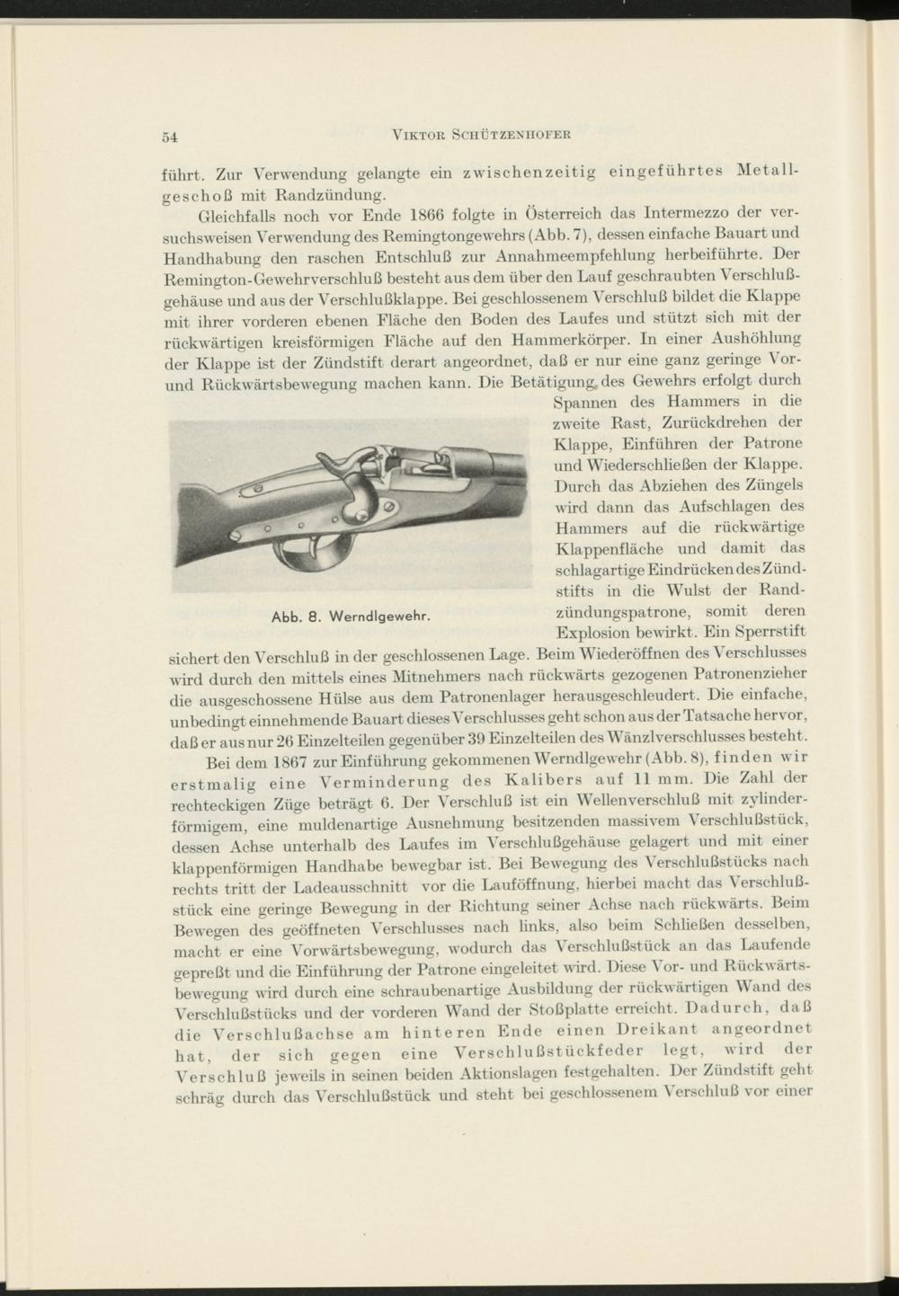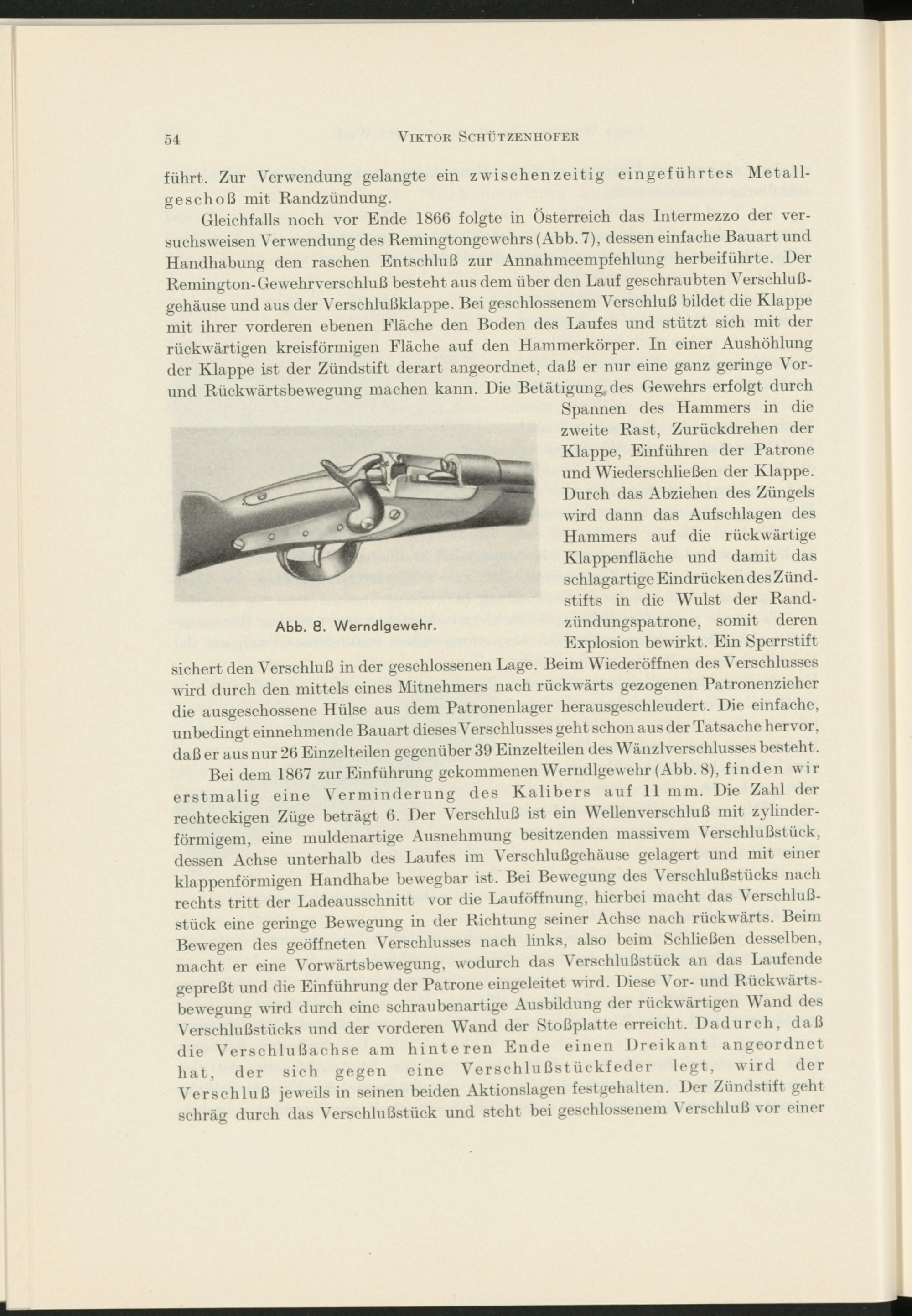 Gleichfalls noch vor Ende 1866 folgte in Österreich das Intermezzo der versuchsweisen Verwendung des Remingtongewehrs (Abb. 7), dessen einfache Bauart und Handhabung den raschen Entschluß zur Annahmeempfehlung herbeiführte. Der Remington- Gewehrverschluß besteht aus dem über den Lauf geschraubten Verschlußgehäuse und aus der Verschlußklappe. Bei geschlossenem Verschluß bildet die Klappe mit ihrer vorderen ebenen Fläche den Boden des Laufes und stützt sich mit der rückwärtigen kreisförmigen Fläche auf den Hammerkörper. In einer Aushöhlung der Klappe ist der Zündstift derart angeordnet, daß er nur eine ganz geringe Vor- und Rückwärtsbewegung machen kann. Die Betätigung, des Gewehrs erfolgt durch