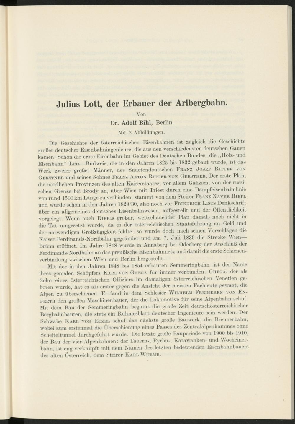 Mit der in den Jahren 1848 bis 1854 erbauten Semmeringbahn ist der Name ihres genialen Schöpfers Karl von Ghega für immer verbunden. Ghega, der als Sohn eines österreichischen Offiziers im damaligen österreichischen Venetien geboren wurde, hat es als erster gegen die Ansicht der meisten Fachleute gewagt, die Alpen zu überschienen. Er fand in dem Schlesier Wilhelm Freiherrn von En- gerth den großen Maschinenbauer, der die Lokomotive für seine Alpenbahn schuf. Mit dem Bau der Semmeringbahn beginnt die große Zeit deutschösterreichischer Bergbahnbauten, die stets ein Ruhmesblatt deutscher Ingenieure sein werden. Der Schwabe Karl von Etzel schuf das nächste große Bauwerk, die Brennerbahn, wobei zum erstenmal die Übersehienung eines Passes des Zentralalpenkammes ohne Scheiteltunnel durchgeführt wurde. Die letzte große Bauperiode von 1900 bis 1910, der Bau der vier Alpenbahnen: der Tauern-, Pyrhn-, Karawanken- und Wocheinerbahn, ist eng verknüpft mit dem Namen des letzten bedeutenden Eisenbahnbauers des alten Österreich, dem Steirer Karl Wtrmb.