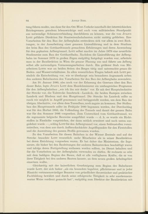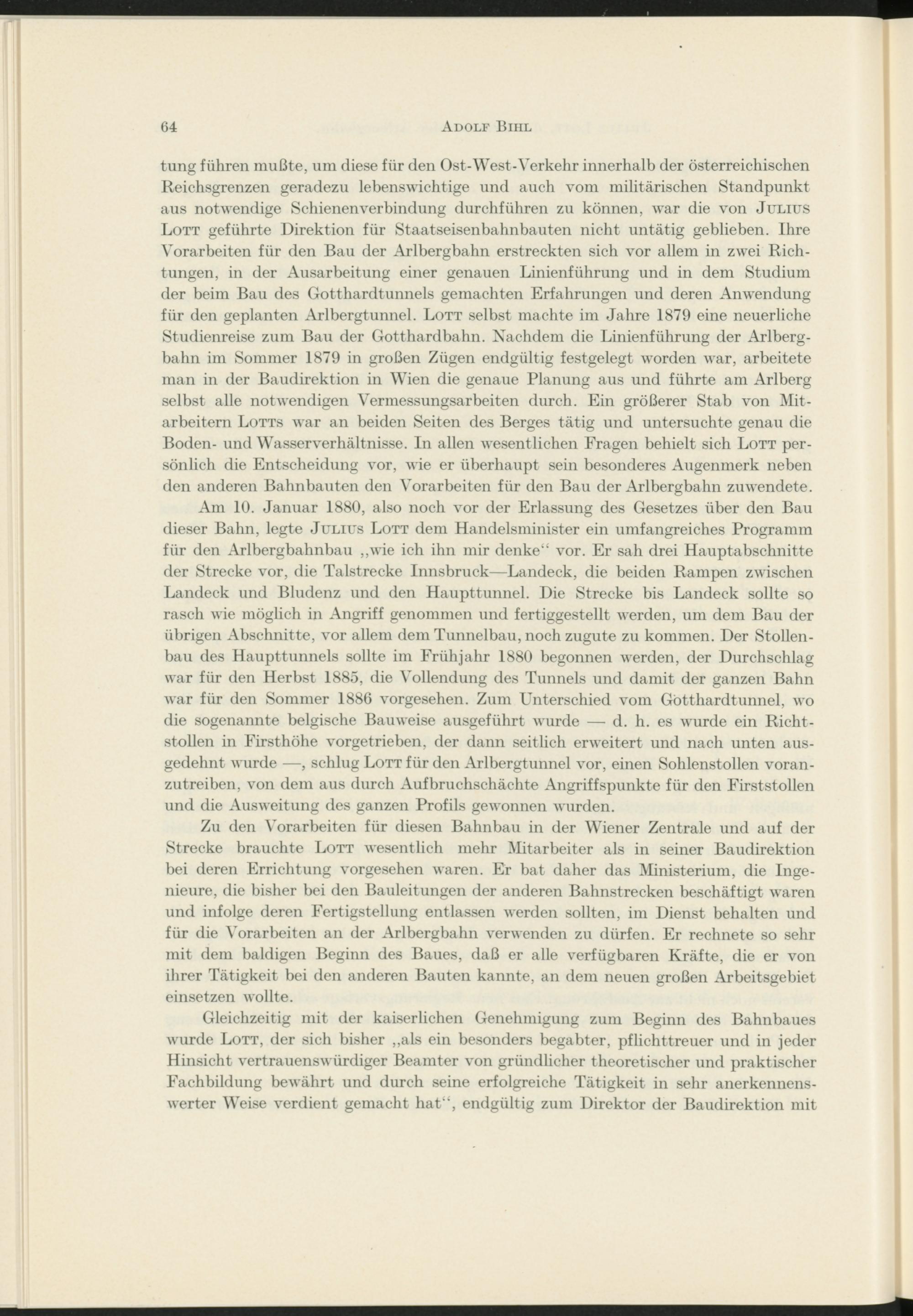tung führen mußte, um diese für den Ost-West-Verkehr innerhalb der österreichischen Reichsgrenzen geradezu lebenswichtige und auch vom militärischen Standpunkt aus notwendige Schienen Verbindung durchführen zu können, war die von Julius Lott geführte Direktion für Staatseisenbahnbauten nicht untätig geblieben. Ihre Vorarbeiten für den Bau der Arlbergbahn erstreckten sich vor allem in zwei Richtungen, in der Ausarbeitung einer genauen Linienführung und in dem Studium der beim Bau des Gotthardtunnels gemachten Erfahrungen und deren Anwendung für den geplanten Arlbergtunnel. Lott selbst machte im Jahre 1879 eine neuerliche Studienreise zum Bau der Gotthardbahn. Nachdem die Linienführung der Arlbergbahn im Sommer 1879 in großen Zügen endgültig festgelegt worden war, arbeitete man in der Baudirektion in Wien die genaue Planung aus und führte am Arlberg selbst alle notwendigen Vermessungsarbeiten durch. Ein größerer Stab von Mitarbeitern Lotts war an beiden Seiten des Berges tätig und untersuchte genau die Boden- und Wasserverhältnisse. In allen wesentlichen Fragen behielt sich Lott persönlich die Entscheidung vor, wie er überhaupt sein besonderes Augenmerk neben den anderen Bahnbauten den Vorarbeiten für den Bau der Arlbergbahn zuwendete.