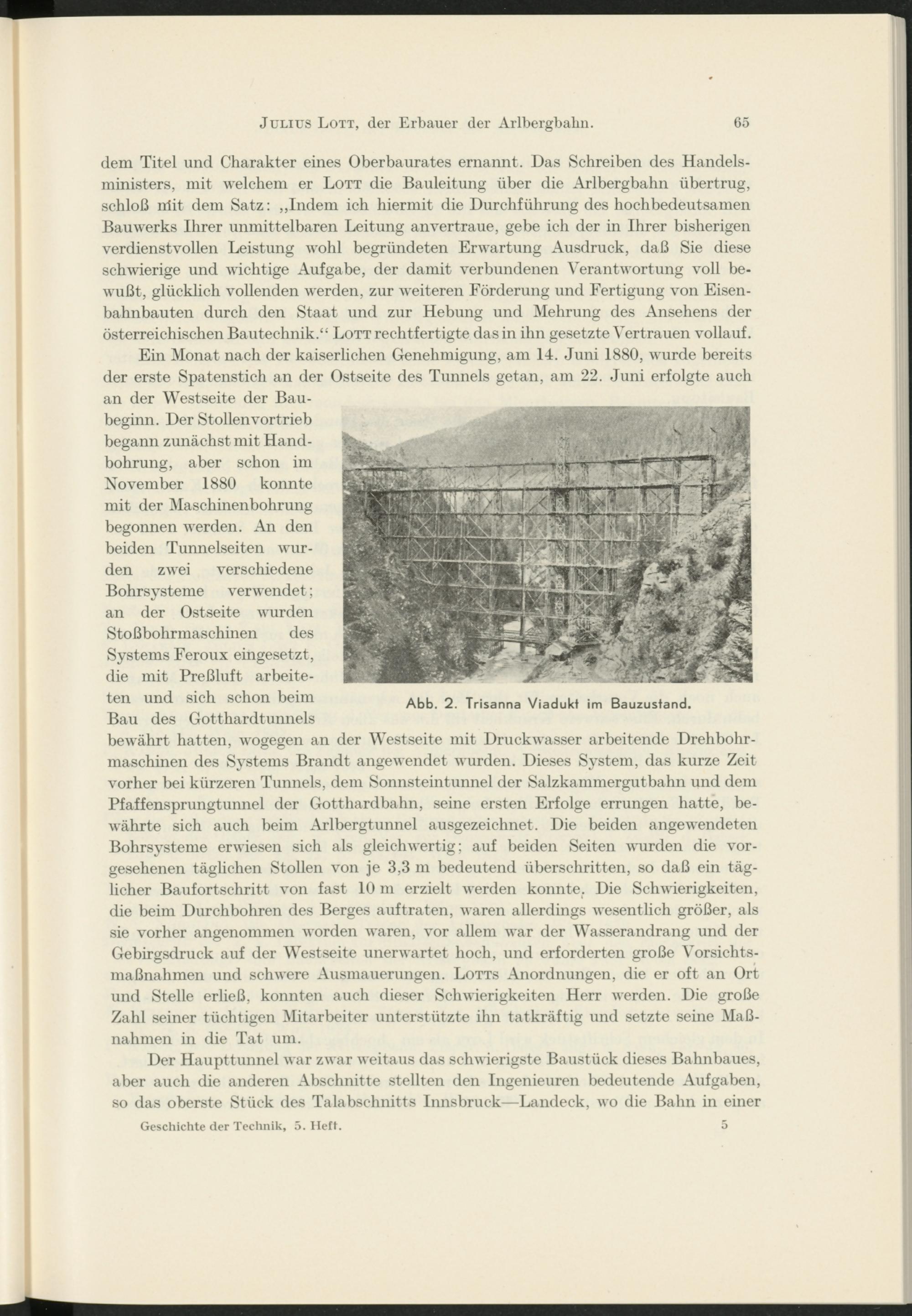 dem Titel und Charakter eines Oberbaurates ernannt. Das Schreiben des Handelsministers, mit welchem er Lott die Bauleitung über die Arlbergbahn übertrug, schloß rrlit dem Satz: „Indem ich hiermit die Durchführung des hochbedeutsamen Bauwerks Ihrer unmittelbaren Leitung anvertraue, gebe ich der in Ihrer bisherigen verdienstvollen Leistung wohl begründeten Erwartung Ausdruck, daß Sie diese schwierige und wichtige Aufgabe, der damit verbundenen Verantwortung voll bewußt, glücklich vollenden werden, zur weiteren Förderung und Fertigung von Eisenbahnbauten durch den Staat und zur Hebung und Mehrung des Ansehens der österreichischen Bautechnik.“ Lott rechtfertigte das in ihn gesetzte Vertrauen vollauf.