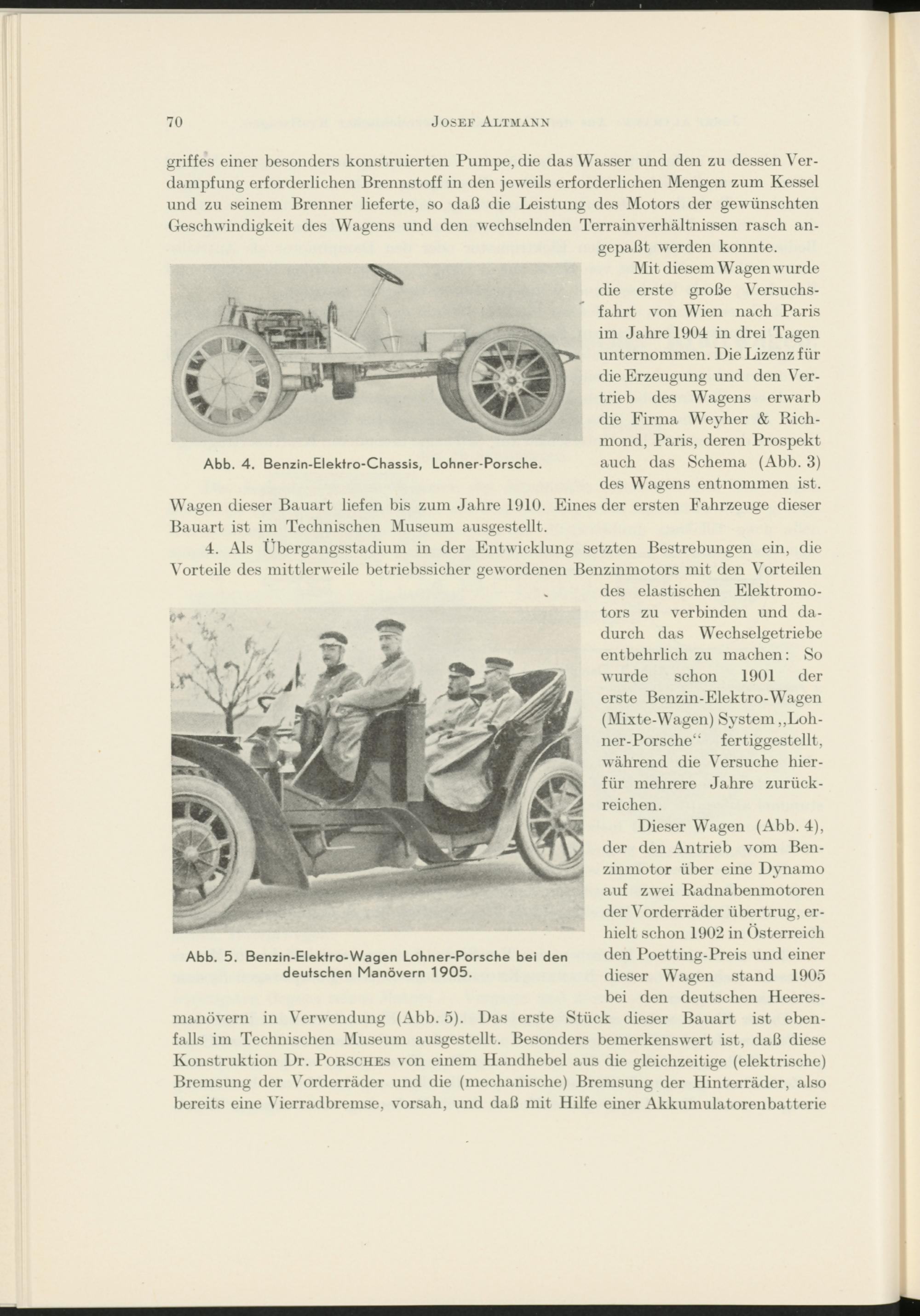 Dieser Wagen (Abb. 4), der den Antrieb vom Benzinmotor über eine Dynamo auf zwei Radnabenmotoren der Vorderräder übertrug, erhielt schon 1902 in Österreich den Poetting-Preis und einer dieser Wagen stand 1905 bei den deutschen Heeresmanövern in Verwendung (Abb. 5). Das erste Stück dieser Bauart ist ebenfalls im Technischen Museum ausgestellt. Besonders bemerkenswert ist, daß diese Konstruktion Dr. Porsches von einem Handhebel aus die gleichzeitige (elektrische) Bremsung der Vorderräder und die (mechanische) Bremsung der Hinterräder, also bereits eine Vierradbremse, vorsah, und daß mit Hilfe einer Akkumulatorenbatterie