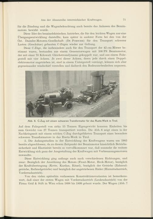 Auf dem Fahrgestell von zirka 15 Tonnen Eigengewicht konnten Einheiten bis zum Gewicht von 27 Tonnen transportiert werden. Die Abb. 6 zeigt einen in der Nachkriegszeit mit einem solchen C-Zug durchgeführten Transport eines besonders schweren Transformators in das Ruetz-Werk in Tirol.