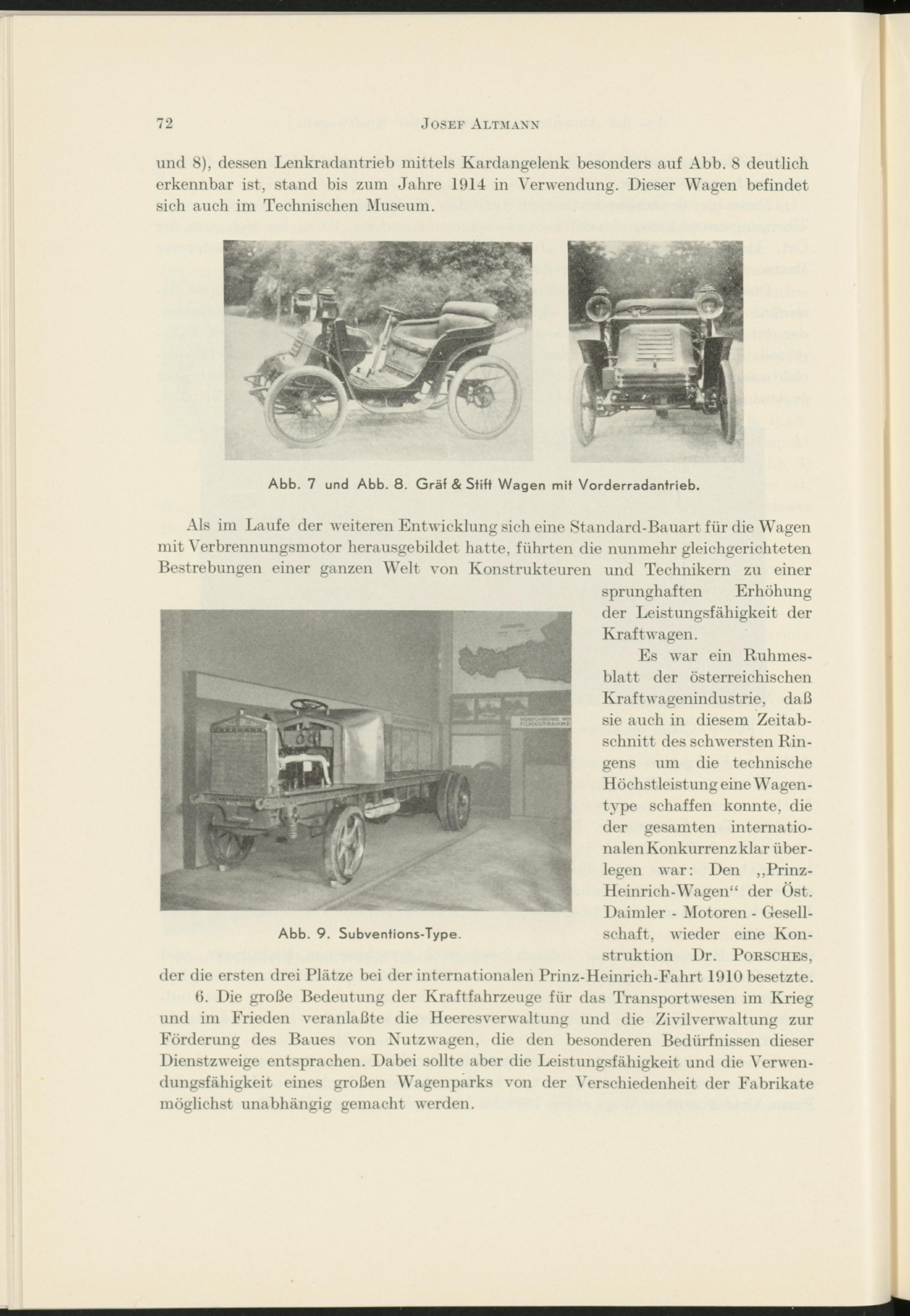 und 8), dessen Lenkradantrieb mittels Kardangelenk besonders auf Abb. 8 deutlich erkennbar ist, stand bis zum Jahre 1914 in Verwendung. Dieser Wagen befindet sich auch im Technischen Museum.