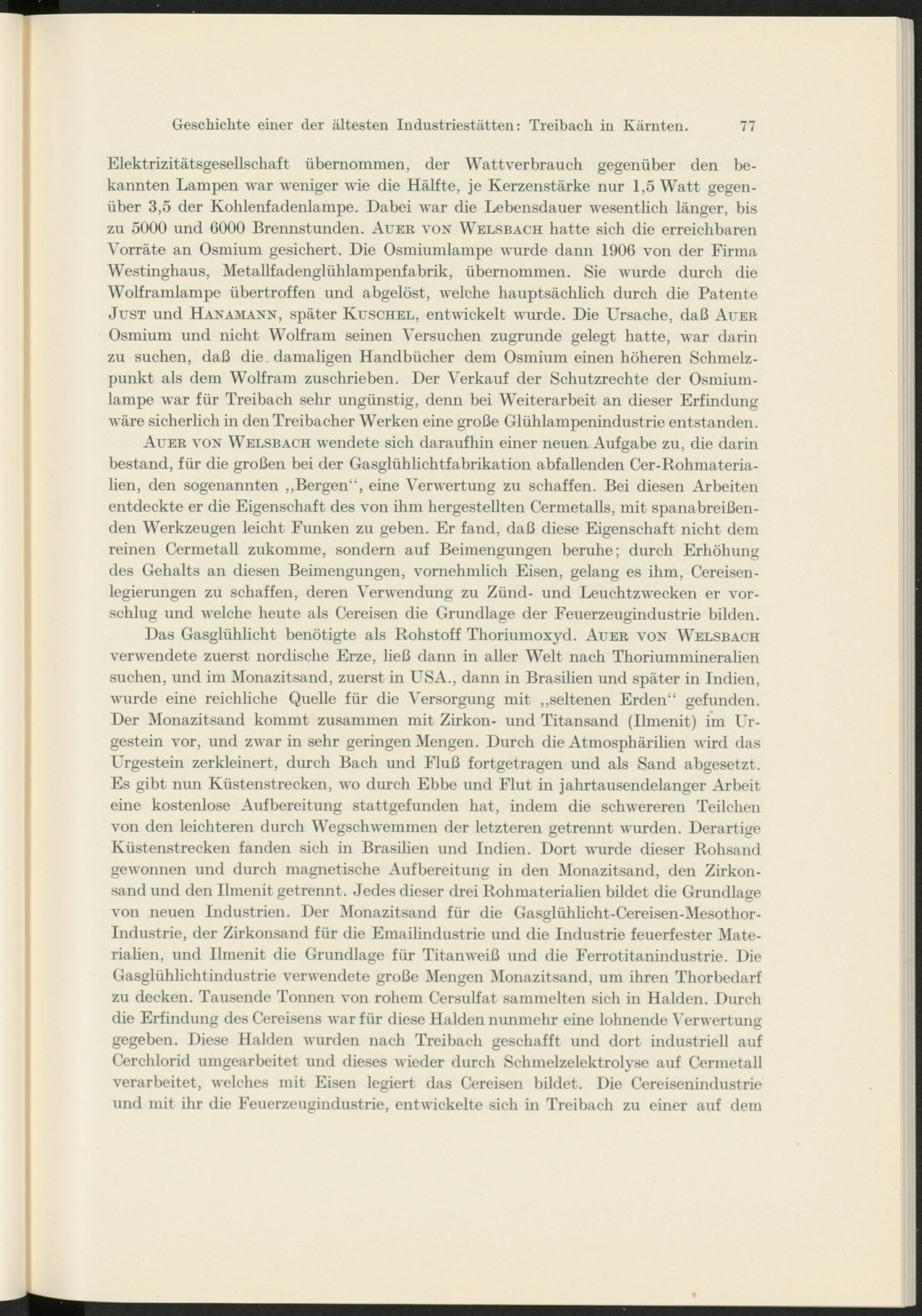 Elektrizitätsgesellschaft übernommen, der Wattverbrauch gegenüber den bekannten Lampen war weniger wie die Hälfte, je Kerzenstärke nur 1,5 Watt gegenüber 3,5 der Kohlenfadenlampe. Dabei war die Lebensdauer wesentlich länger, bis zu 5000 und 0000 Brennstunden. Auer von Welsbach hatte sich die erreichbaren Vorräte an Osmium gesichert. Die Osmiumlampe wurde dann 1906 von der Firma Westinghaus, Metallfadenglühlampenfabrik, übernommen. Sie wurde durch die Wolframlampe übertroffen und abgelöst, welche hauptsächlich durch die Patente Just und Hanamann, später Kuschel, entwickelt wurde. Die Ursache, daß Auer Osmium und nicht Wolfram seinen Versuchen zugrunde gelegt hatte, war darin zu suchen, daß die. damaligen Handbücher dem Osmium einen höheren Schmelzpunkt als dem Wolfram zuschrieben. Der Verkauf der Schutzrechte der Osmiumlampe war für Treibach sehr ungünstig, denn bei Weiterarbeit an dieser Erfindung wäre sicherlich in den Treibacher Werken eine große Glühlampenindustrie entstanden.