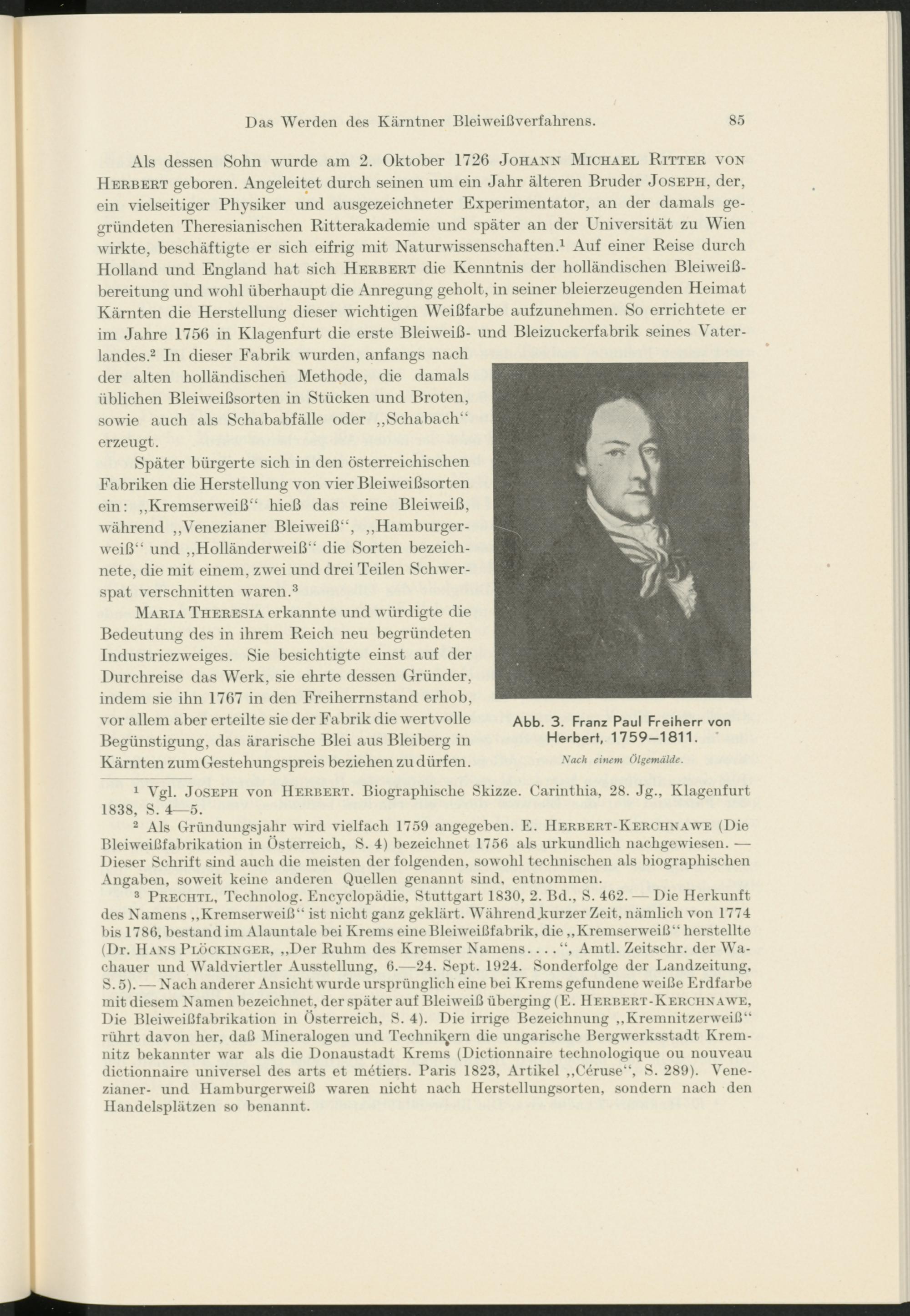Als dessen Sohn wurde am 2. Oktober 1726 Johann Michael Ritter von Herbert geboren. Angeleitet durch seinen um ein Jahr älteren Bruder Joseph, der, ein vielseitiger Physiker und ausgezeichneter Experimentator, an der damals gegründeten Theresianischen Ritterakademie und später an der Universität zu Wien wirkte, beschäftigte er sich eifrig mit Naturwissenschaften. 1 Auf einer Reise durch Holland und England hat sich Herbert die Kenntnis der holländischen Bleiweißbereitung und wohl überhaupt die Anregung geholt, in seiner bleierzeugenden Heimat Kärnten die Herstellung dieser wichtigen Weißfarbe aufzunehmen. So errichtete er im Jahre 1756 in Klagenfurt die erste Bleiweiß- und Bleizuckerfabrik seines Vaterlandes. 2 In dieser Fabrik wurden, anfangs nach der alten holländischen Methode, die damals üblichen Bleiweißsorten in Stücken und Broten, sowie auch als Schababfälle oder „Schabach“ erzeugt.