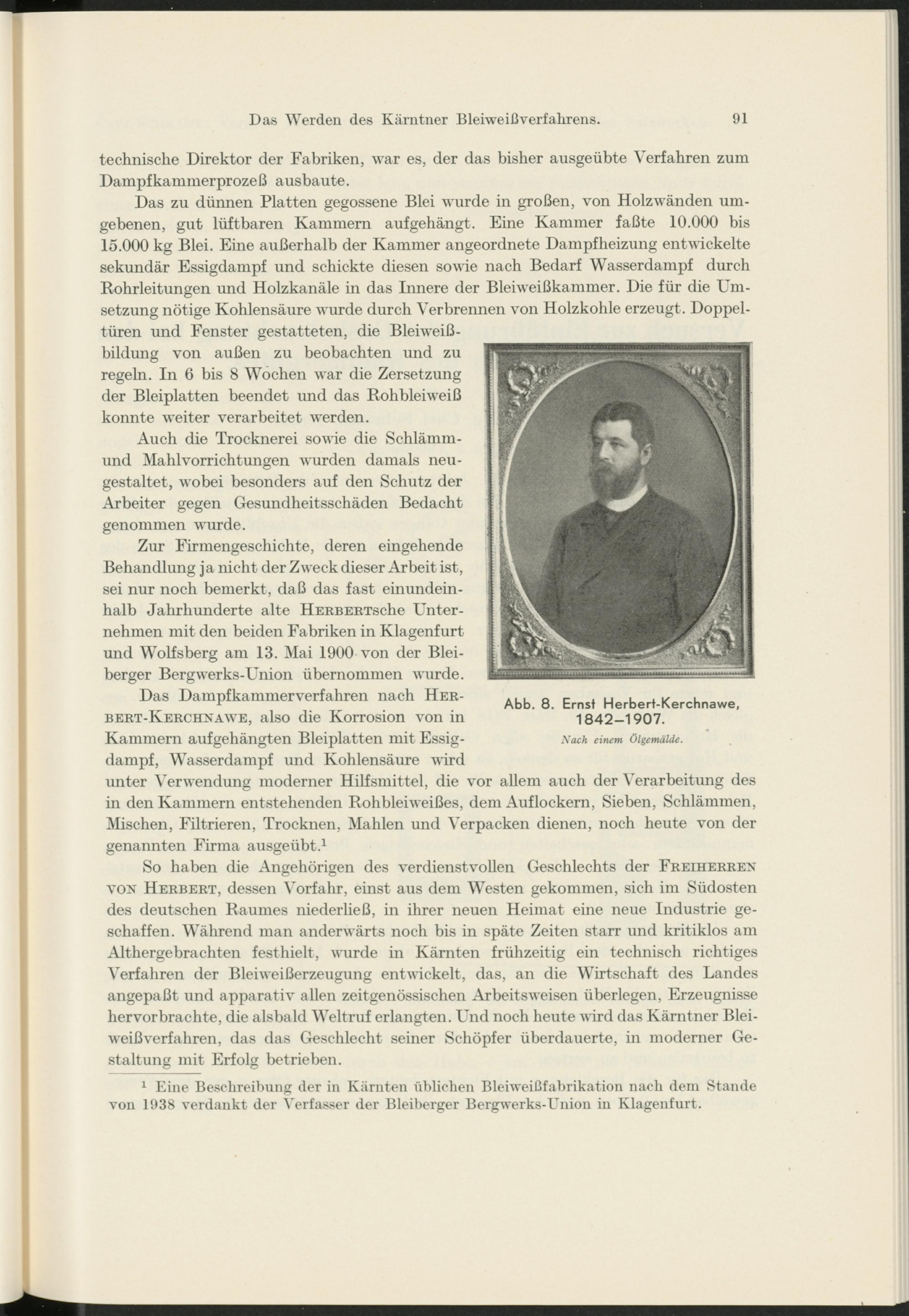So haben die Angehörigen des verdienstvollen Geschlechts der Freiherren von Herbert, dessen Vorfahr, einst aus dem Westen gekommen, sich im Südosten des deutschen Raumes niederließ, in ihrer neuen Heimat eine neue Industrie geschaffen. Während man anderwärts noch bis in späte Zeiten starr und kritiklos am Althergebrachten festhielt, wurde in Kärnten frühzeitig ein technisch richtiges Verfahren der Bleiweißerzeugung entwickelt, das, an die Wirtschaft des Landes angepaßt und apparativ allen zeitgenössischen Arbeitsweisen überlegen, Erzeugnisse hervor brachte, die alsbald Weltruf erlangten. Und noch heute wird das Kärntner Bleiweißverfahren, das das Geschlecht seiner Schöpfer überdauerte, in moderner Gestaltung mit Erfolg betrieben.