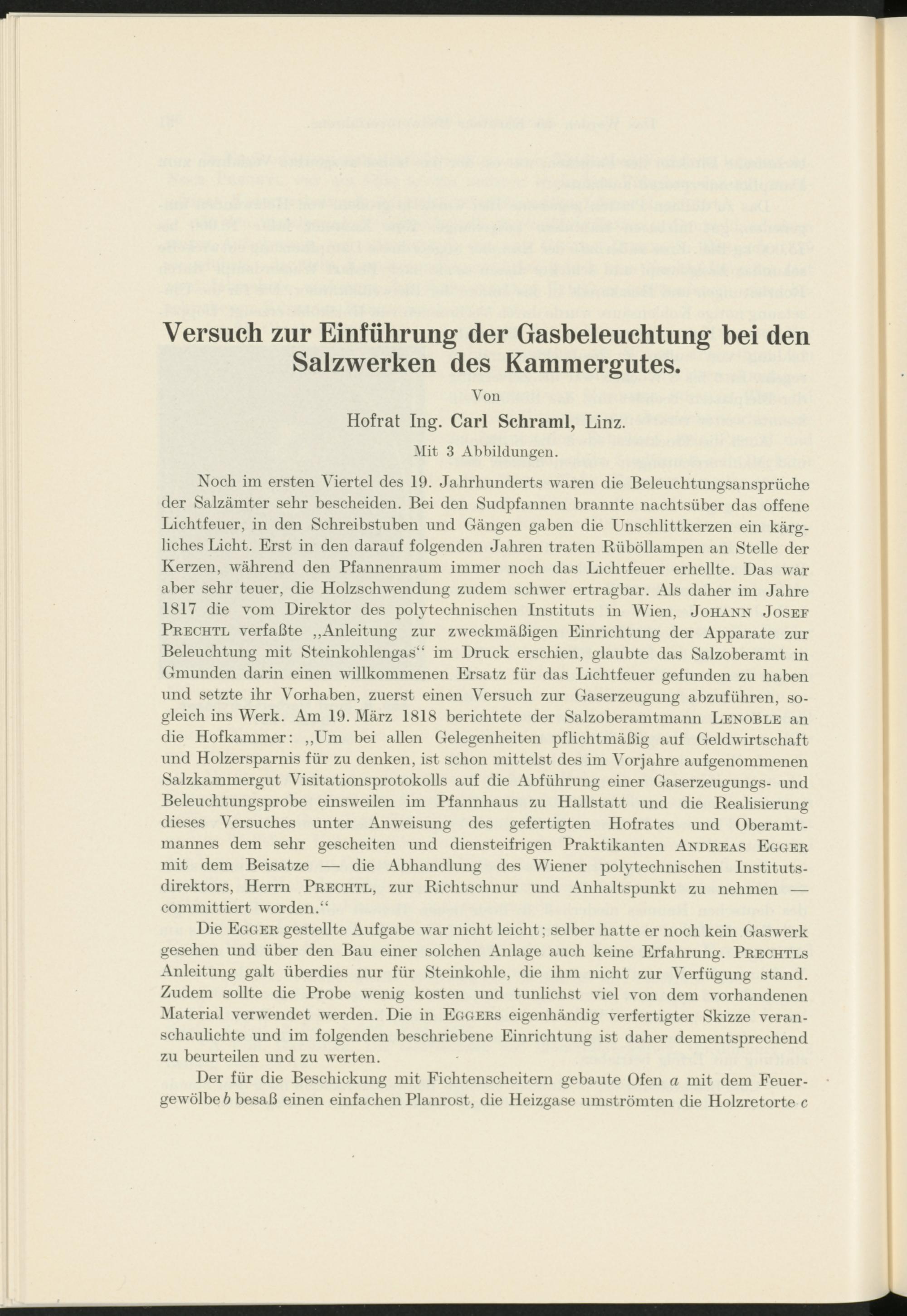 Noch im ersten Viertel des 19. Jahrhunderts waren die Beleuchtungsansprüche der Salzämter sehr bescheiden. Bei den Sudpfannen brannte nachtsüber das offene Lichtfeuer, in den Schreibstuben und Gängen gaben die Unschlittkerzen ein kärgliches Licht. Erst in den darauf folgenden Jahren traten Rüböllampen an Stelle der Kerzen, während den Pfannenraum immer noch das Lichtfeuer erhellte. Das war aber sehr teuer, die Holzschwendung zudem schwer ertragbar. Als daher im Jahre 1817 die vom Direktor des polytechnischen Instituts in Wien, Johann Josef Prechtl verfaßte „Anleitung zur zweckmäßigen Einrichtung der Apparate zur Beleuchtung mit Steinkohlengas“ im Druck erschien, glaubte das Salzoberamt in Gmunden darin einen willkommenen Ersatz für das Lichtfeuer gefunden zu haben und setzte ihr Vorhaben, zuerst einen Versuch zur Gaserzeugung abzuführen, sogleich ins Werk. Am 19. März 1818 berichtete der Salzoberamtmann Lenoble an die Hofkammer: ,,L T m bei allen Gelegenheiten pflichtmäßig auf Geldwirtschaft und Holzersparnis für zu denken, ist schon mittelst des im Vorjahre aufgenommenen Salzkammergut Visitationsprotokolls auf die Abführung einer Gaserzeugungs- und Beleuchtungsprobe einsweilen im Pfannhaus zu Hallstatt und die Realisierung dieses Versuches unter Anweisung des gefertigten Hofrates und Oberamtmannes dem sehr gescheiten und diensteifrigen Praktikanten Andreas Egger mit dem Beisatze — die Abhandlung des Wiener polytechnischen Institutsdirektors, Herrn Prechtl, zur Richtschnur und Anhaltspunkt zu nehmen — committiert worden.“