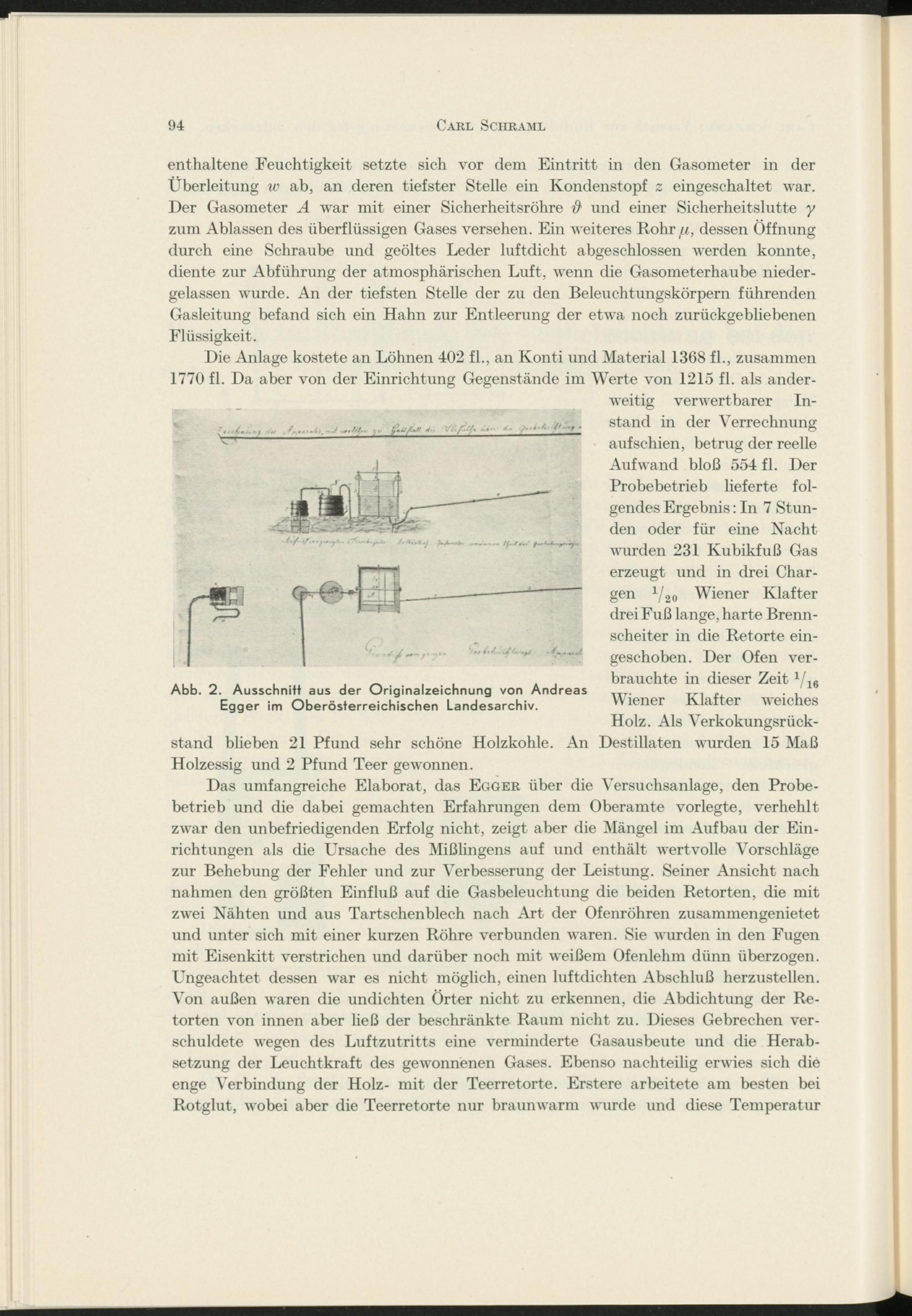Die Anlage kostete an Löhnen 402 fl., an Konti und Material 1368 fl., zusammen 1770 fl. Da aber von der Einrichtung Gegenstände im Werte von 1215 fl. als anderweitig verwertbarer Instand in der Verrechnung auf schien, betrug der reelle Aufwand bloß 554 fl. Der Probebetrieb lieferte folgendes Ergebnis: In 7 Stunden oder für eine Nacht wurden 231 Kubikfuß Gas erzeugt und in drei Chargen V 20 Wiener Klafter drei Fuß lange, harte Brennscheiter in die Retorte eingeschoben. Der Ofen verbrauchte in dieser Zeit 1 / 16 Wiener Klafter weiches Holz. Als Verkokungsrückstand blieben 21 Pfund sehr schöne Holzkohle. An Destillaten wurden 15 Maß Holzessig und 2 Pfund Teer gewonnen.