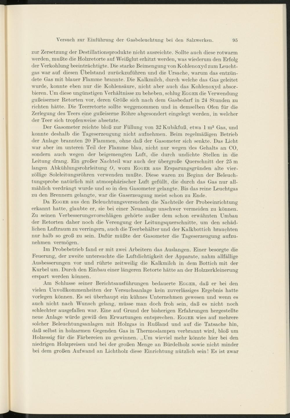 Der Gasometer reichte bloß zur Füllung von 32 Kubikfuß, etwa 1 m 3 Gas, und konnte deshalb die Tageserzeugung nicht auf nehmen. Beim regelmäßigen Betrieb der Anlage brannten 20 Flammen, ohne daß der Gasometer sich senkte. Das Licht war aber im unteren Teil der Flamme blau, nicht nur wegen des Gehalts an CO, sondern auch wegen der beigemengten Luft, die durch undichte Stellen in die Leitung drang. Ein großer Nachteil war auch der übergroße Querschnitt der 25 m langen Abkühlungsrohrleitung 0 , wozu Egger a\is Ersparungsgründen alte vierzöllige Soleleitungsröhren verwenden mußte. Diese waren zu Beginn der Beleuchtungsprobe natürlich mit atmosphärischer Luft gefüllt, die durch das Gas nur allmählich verdrängt wurde und so in den Gasometer gelangte. Bis das reine Leuchtgas zu den Brennern gelangte, war die Gaserzeugung meist schon zu Ende.